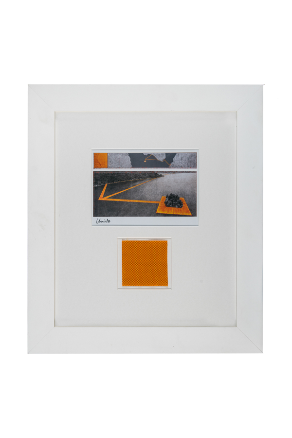 Christo Javasev, The Floating Piers. 2016. Offset e stoffa. mm 120x165 e cm 7x7. Firma a pennarello nero al margine inferiore sinistro dell'offset. La stoffa è una parte del rivestimento della passerella galleggiante che Christo e Jeanne-Claude hanno progettato per l'installazione di Land Art nel 2016 e che rendeva percorribile la distanza tra Sulzano, Montisola e l'Isola di San Paolo. (1)