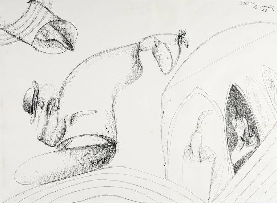 Renato Ranaldi, Inferno. 1965. Penna e inchiostro di china nero su carta filigranata Fabriano. mm 480x660. Titolato, firmato e datato all'angolo superiore destro. (1)