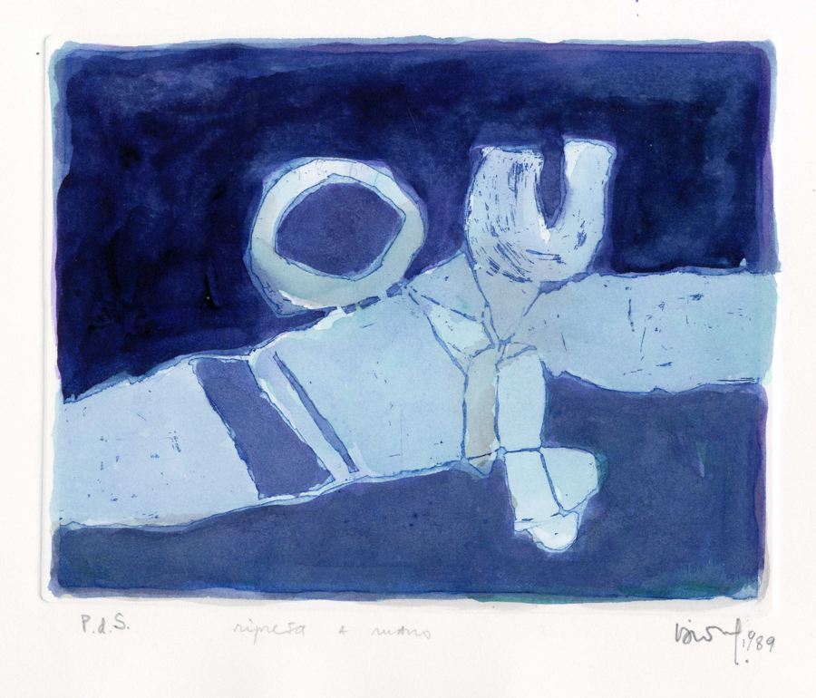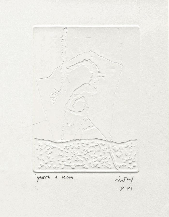 Domenico Ucciobiondi, Notte infinita. 1989-91. 1 acquatinta ripresa a mano e 1 acquaforte su carta Fabriano. mm 237x300 e 200x145. Fogli: mm 500x350 cad. Entrambe firmate, datate e con iscritte le specifiche dell'opera a matita. Una delle due incisioni ha il timbro a secco dell'artista ed entrambe la velina protettiva con il timbro dell'artista stesso. (1)