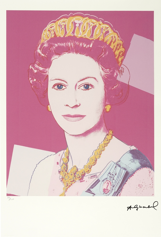 Andy Warhol [da], Regina Elisabetta. Offset su carta Arches. mm 427x340 cad. Fogli: mm 570x385 cad. Entrambi con firma stampigliata in basso a destra e tiratura a matita in basso a sinistra. Entrambi i fogli riportano il timbro a secco de Georges Israel Editeur in basso a sinistra e doppio timbro a inchiostro blu al verso: "Art Gallery New York 530 West 25th Street New York NY 10001" e "Leo Castelli New York". Uno dei due fogli è accompagnato dal certificato con la reference di catalogo. Es. 17/100 e 52/100. (2)