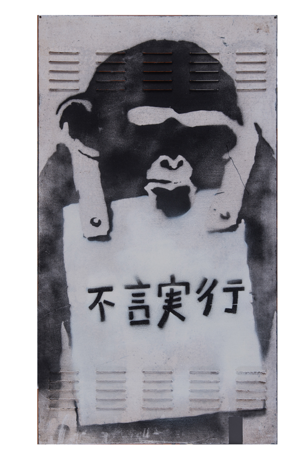 Banksy, L'azione prima delle parole. 2018. Vernice spray su sportello metallico di accesso. cm 95,5x52,5. Titolato in lingua giapponese in basso al centro. Opera accompagnata dal certificato di autenticità di Rare&Signed con il codice:R&SD30361659217. (1)