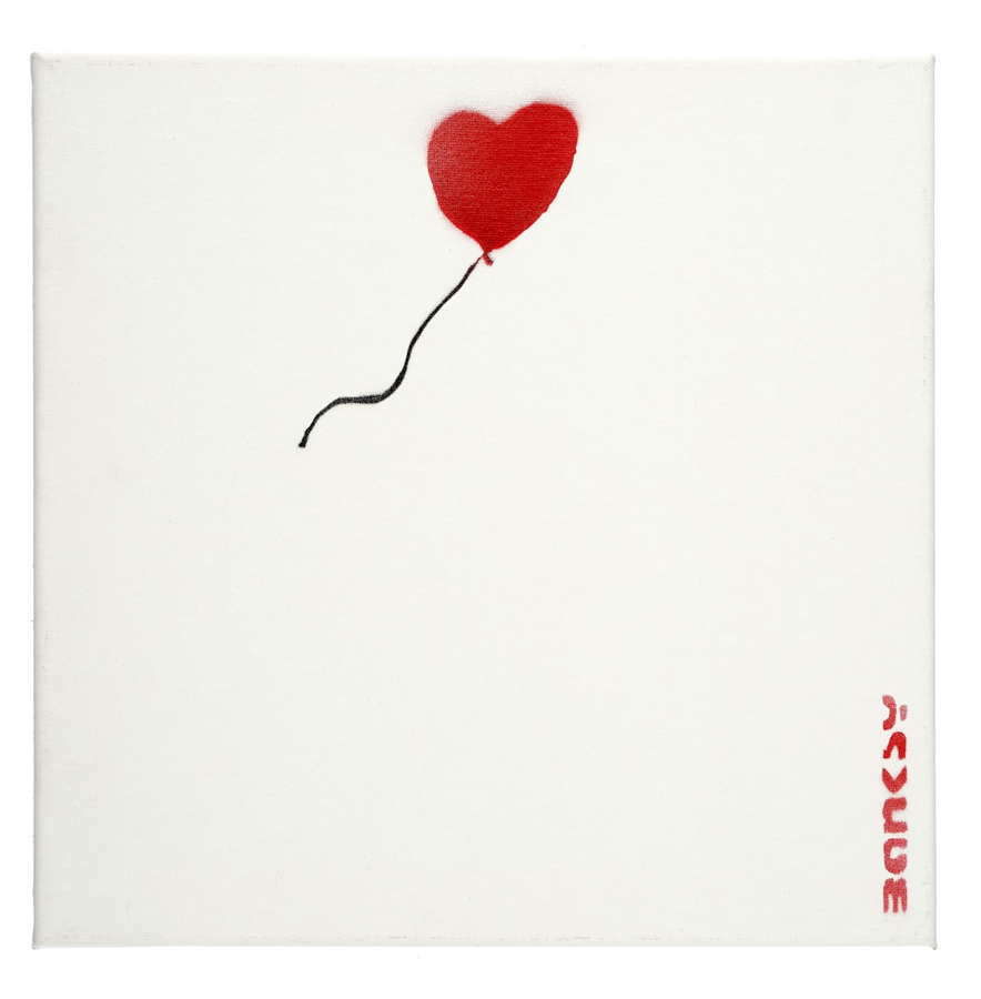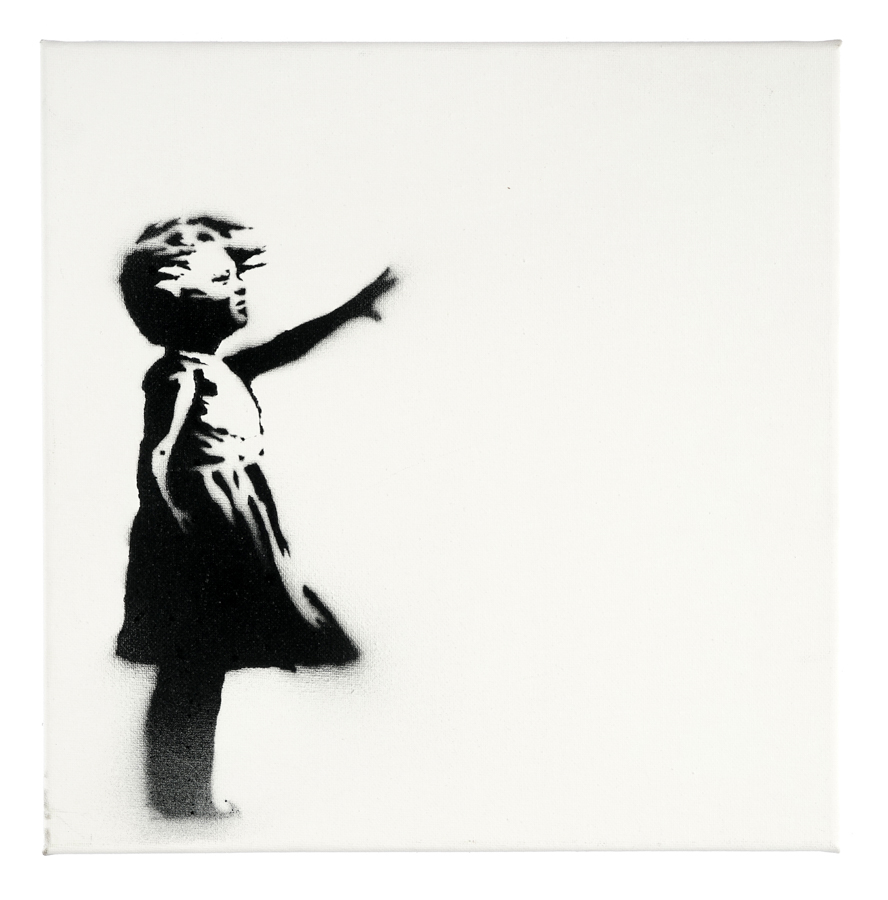 Banksy, Dismaland. The Balloon Girl. 2015. Vernice spray su tele. Dittico. cm 30x30 cad. Firma dell'artista in basso a destra. Al verso di entrambe le tele sono presenti il timbro di Dismaland, l'anno di creazione e la tiratura a pennarello nero. Al verso di una delle due tele è presente la firma, sempre a pennarello nero. Es. 2/5. L'opera è accompagnata dal certificato di autenticità di Rare&Signed con il codice R&SD30361659205 e dal biglietto di ingresso a Dismaland. (2)