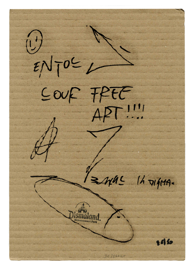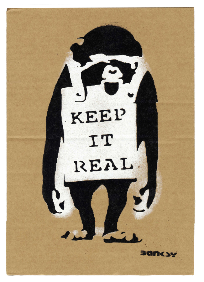 Banksy, Dismaland. Keep it real. 2015. Stencil su cartone. cm 29,7x21. Timbro in basso a destra: "Banksy". Al verso timbro di Dismaland e iscritto: "Enjoy your free art. Banksy is dismal" e tiratura in basso a destra. Accompagnato dal tick d'ingresso a Dismaland, con QR code e codice a barre. Il nome del partecipante è stato cancellato a pennarello per motivi di privacy. Provenienza: Performance di Banksy a Dismaland (agosto/settembre 2015); Collezione milanese. (1)
