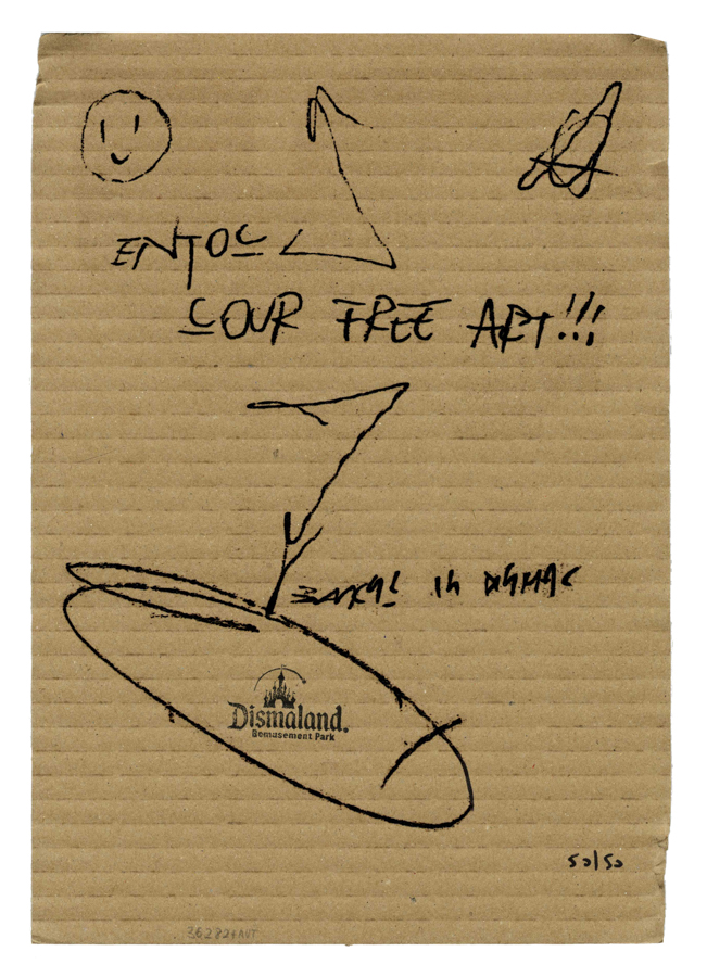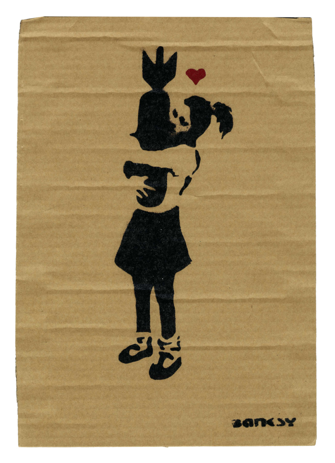 Banksy, Dismaland. Bomb Hugger. 2015. Stencil su cartone. cm 29,7x21. Timbro in basso a destra: "Banksy". Al verso timbro di Dismaland e iscritto: "Enjoy your free art. Banksy is dismal" e tiratura in basso a destra. Accompagnato dal tick d'ingresso a Dismaland, con QR code e codice a barre. Il nome del partecipante è stato cancellato a pennarello per motivi di privacy. Provenienza: Performance di Banksy a Dismaland (agosto/settembre 2015); Collezione milanese. (1)