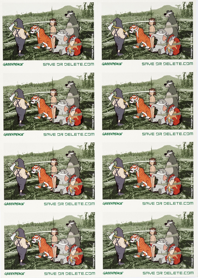Banksy, Greenpeace. Save Dr Delete.com. A last chance to save the world's ancient forests. 2002. Offset su carta riciclata e completo di 8 stickers. mm 419x594. Rara edizione Commissionata da Greenpeace per la campagna 'Save or Delete - A last chance to save the world's ancient forests'. Bansksy realizza per Greenpeace la campagna di sensibilizzazione per evidenziare i problemi della deforestazione globale e combattere il commercio illegale di legname. Le stampe sono state ritirate dopo una disputa con la Disney che ha diffidato Greenpeace dall'utilizzare i personaggi del cartoon per la campagna divulgativa ma alcuni manifesti erano già stampati, inviati e affissi per le strade di Londra. Sono rappresentati alcuni dei personaggi principali del 'Il Libro della Giungla' della Disney trasposti su un'immagine fotografica di una reale foresta devastata. (1)