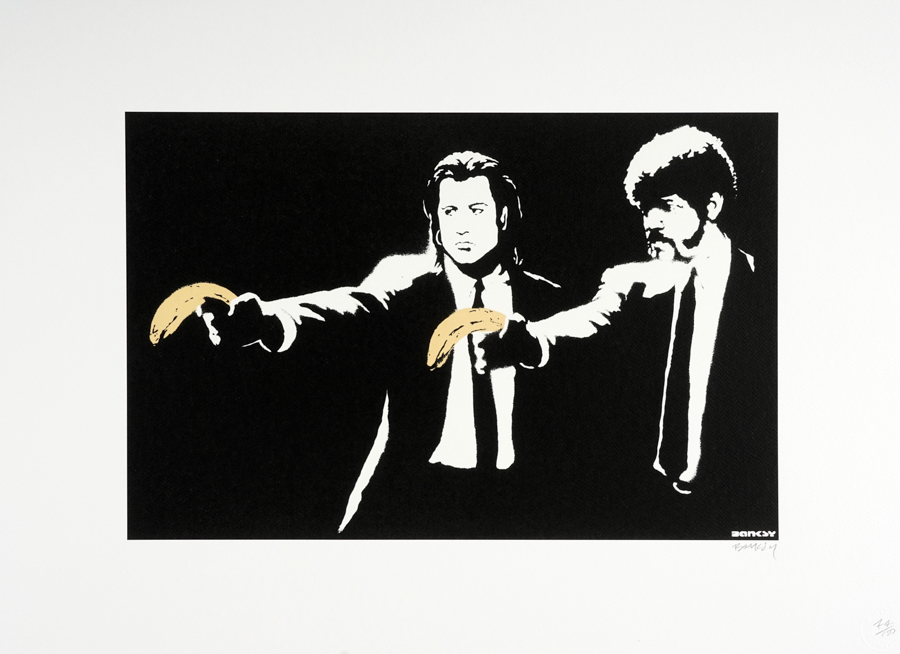 Banksy [da], Pulp Fiction. Litografia. mm 320x484. Foglio: mm 500x700. Firma in lastra in basso a destra. Iscritto "Banksy" e la tiratura a matita in basso a destra. Doppio timbro a secco in basso ai lati. Es. 74/150. (1)