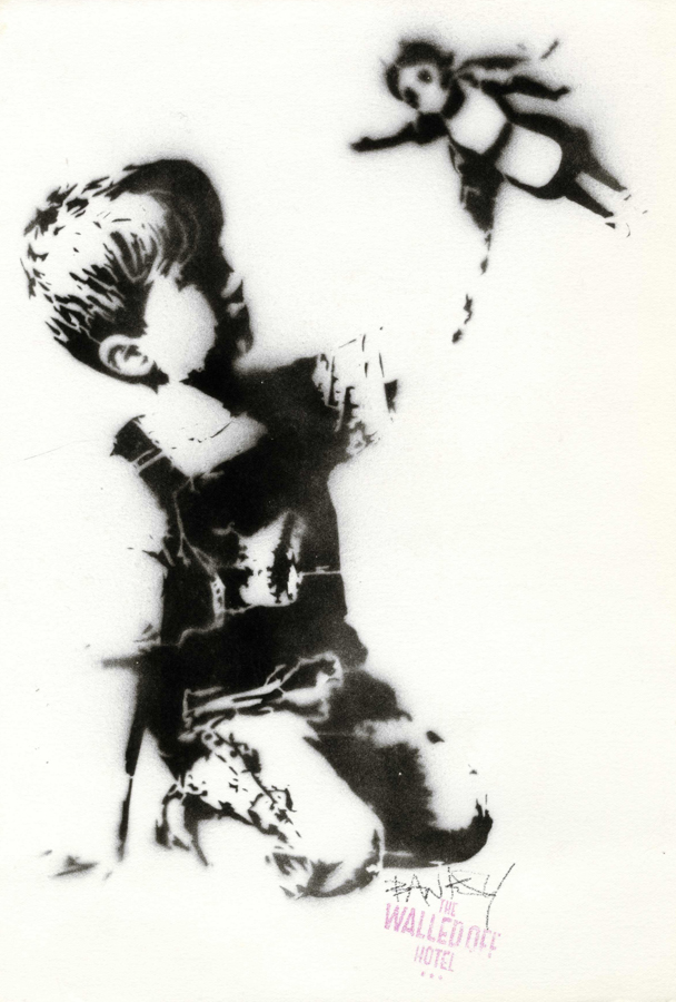 Banksy, The Walled Off Hotel. Game changer. 2017. Stencil e vernice spray su cartoncino. cm 29,5x19,6. Timbro in basso a destra: "Banksy" e sotto: "The Walled Off Hotel. Wall Mart". Al verso timbro: Free Palestine, Free Syria, Free Libya". Provenienza: collezione londinese; importante collezione fiorentina. The Walled Off Hotel, voluto da Banksy nel 2017 con vista sul muro che divide la Palestina da Israele, rimanda simbolicamente alla catena di hotel di lusso Waldorf. (1)