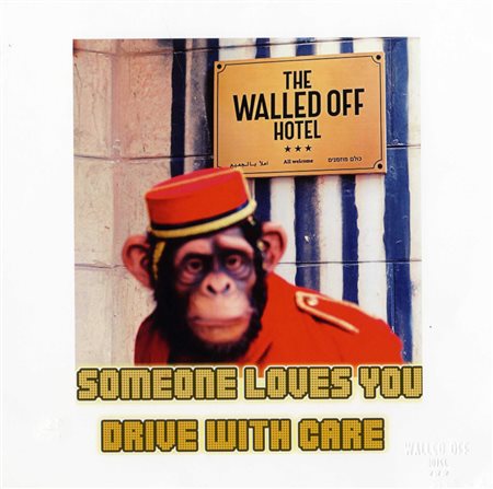 Banksy, The Walled Off Hotel. Someone loves you. Drive with care. Offset. mm 210x210. Timbro a secco del Walled Off Hotel in basso a destra e timbro a inchiostro rosa al verso. Al verso anche tiratura e codice dell'opera. Opera accompagnata dalla fattura di acquisto. Es. 22/1500. (1)