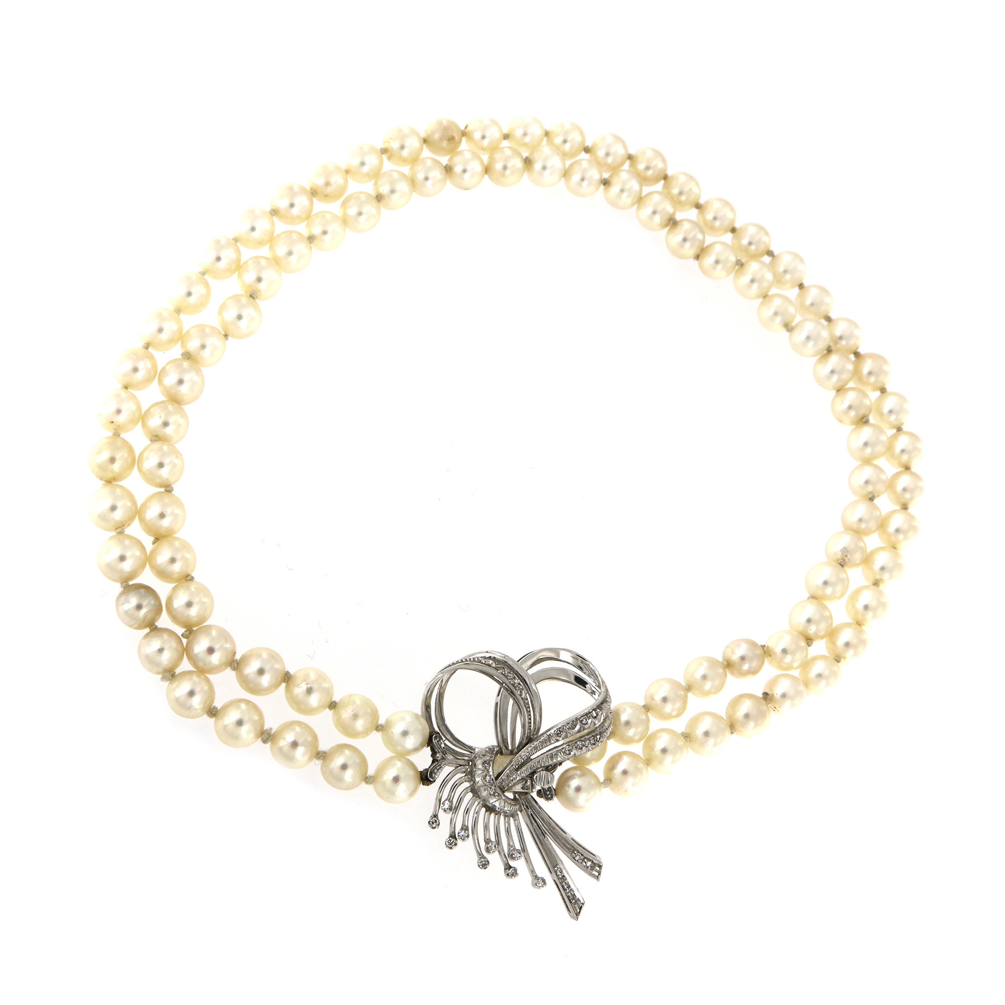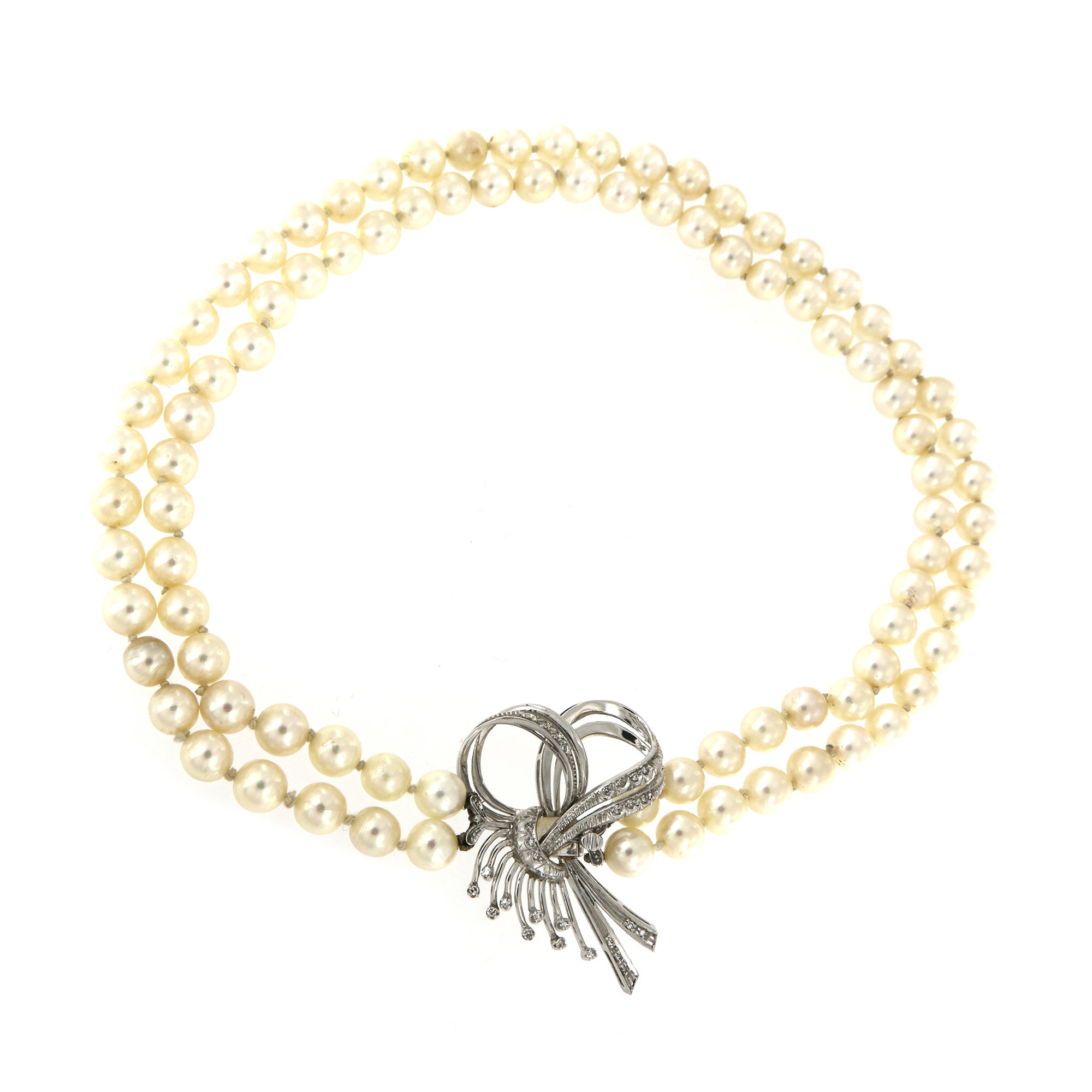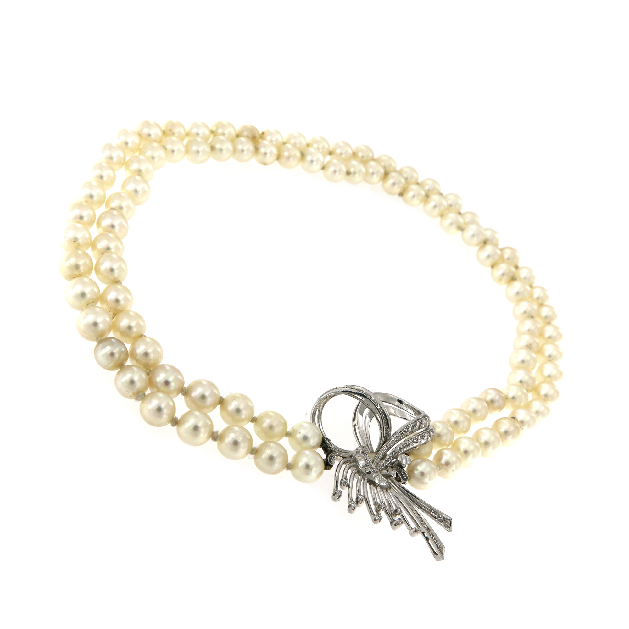 Collana perle con chiusura in oro bianco 18 kt con diamanti taglio 8x8 per complessivi ct 0,30 e perle coltivate diametro 7 - 7 1/2, lunghezza cm 42, grammi 67.90