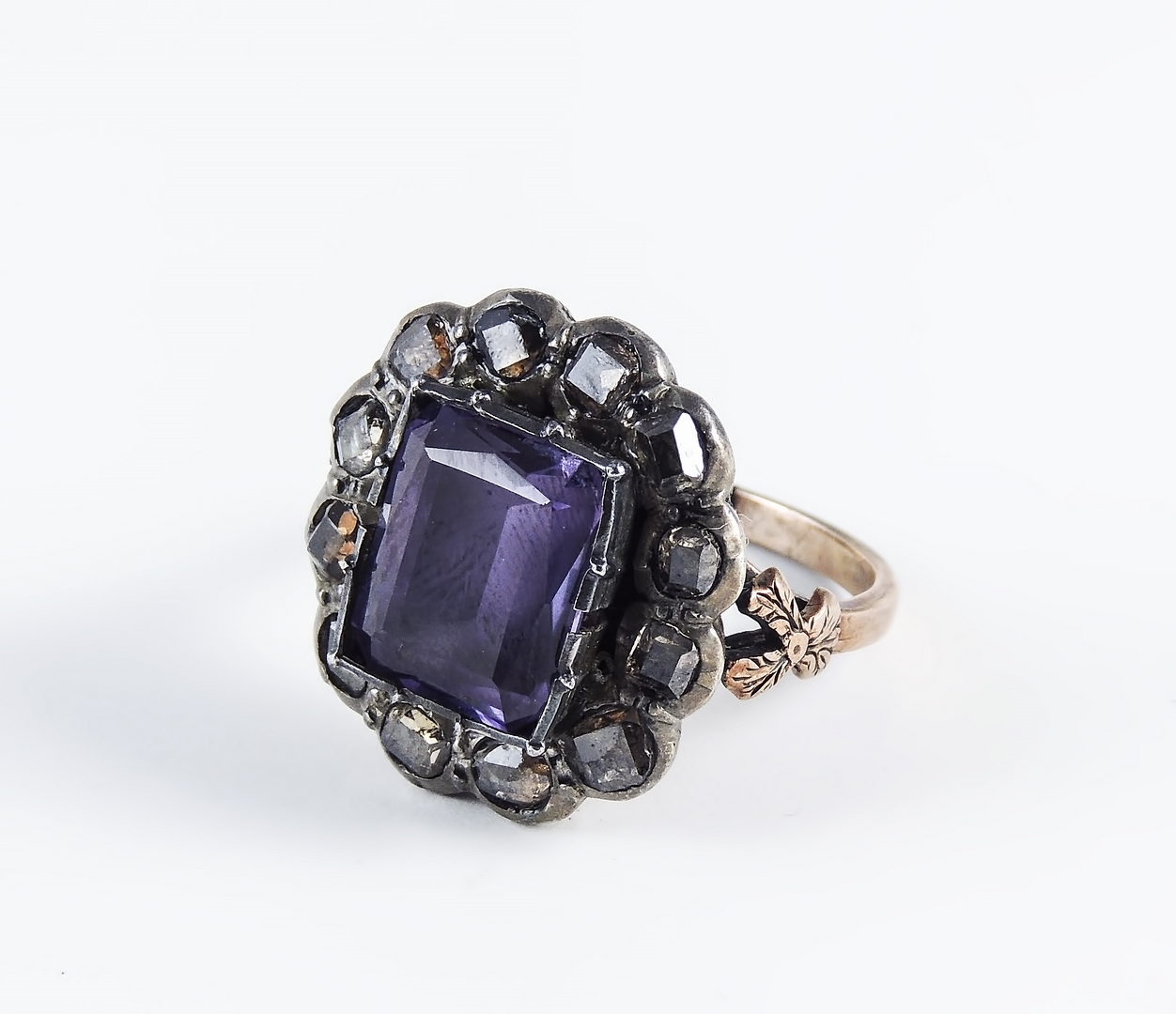 ANELLO IN ORO A BASSO TITOLO, ARGENTO, AMETISTA E ROSE DI DIAMANTI - GOLD, SILVER, AMETHYST AND DIAMONDS RING fine del XIX secolo - late 19th Century al centro ametista di taglio smeraldo impreziosita da rose di diamanti gr 8,5