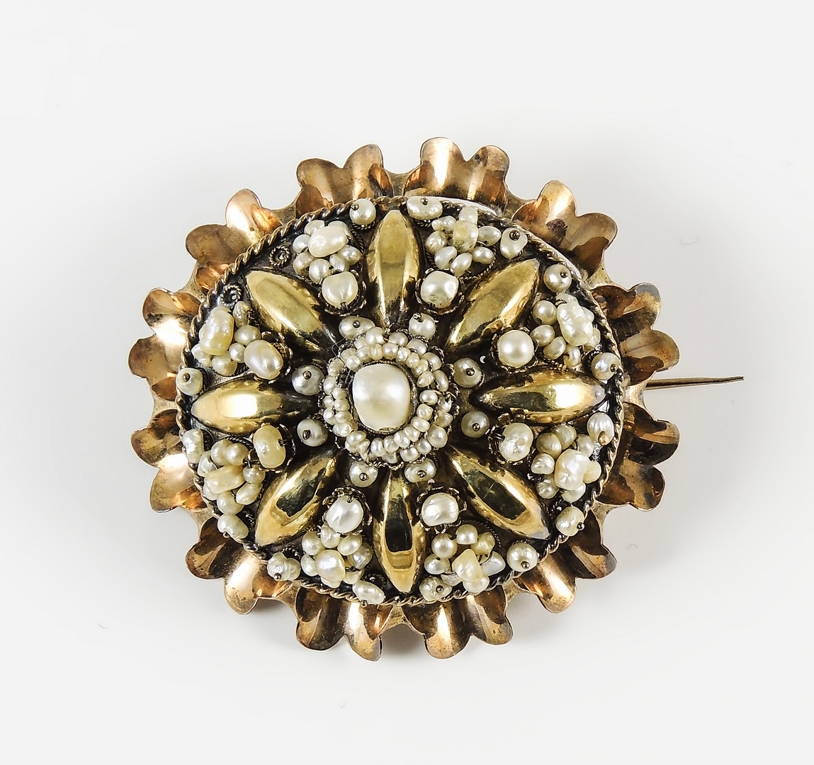 SPILLA IN ORO A BASSO TITOLO E MICROPERLE - GOLD AND SMALL PEARLS BROOCH Palermo, fine del XIX secolo - Palermo, late 19th Century di forma circolare bombata ad imitazione di un fiore impreziosito da microperle, orlo a nastro gr 18,5