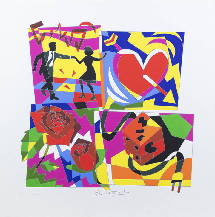 50x50 serigrafia a 46 passaggi di colore con interventi in carborundum, collage, floccaggi e passaggio calcografico a secco, es. 71/99