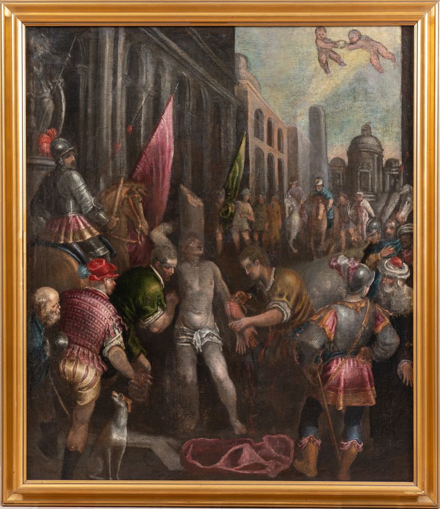 Ambito di Francesco Bassano, XVII secolo. "Martirio di San Bartolomeo". Olio...