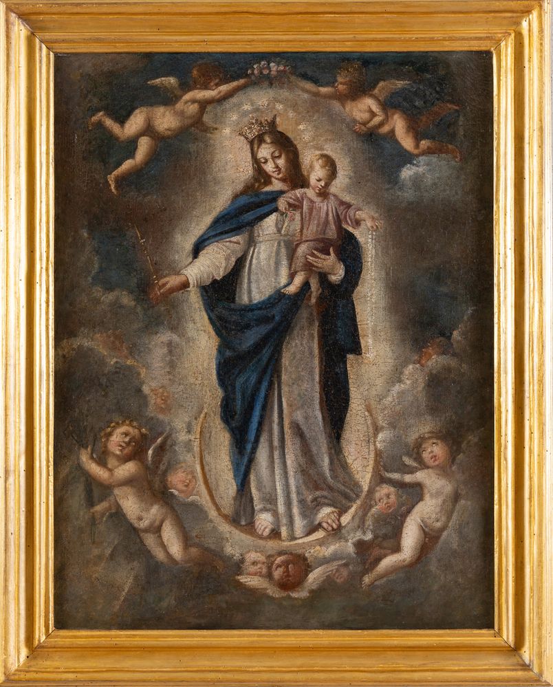 Maestro del XVII secolo. "Madonna in gloria con Bambino e angeli". Olio su tela. Cm 72x55,5.