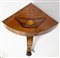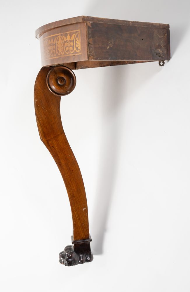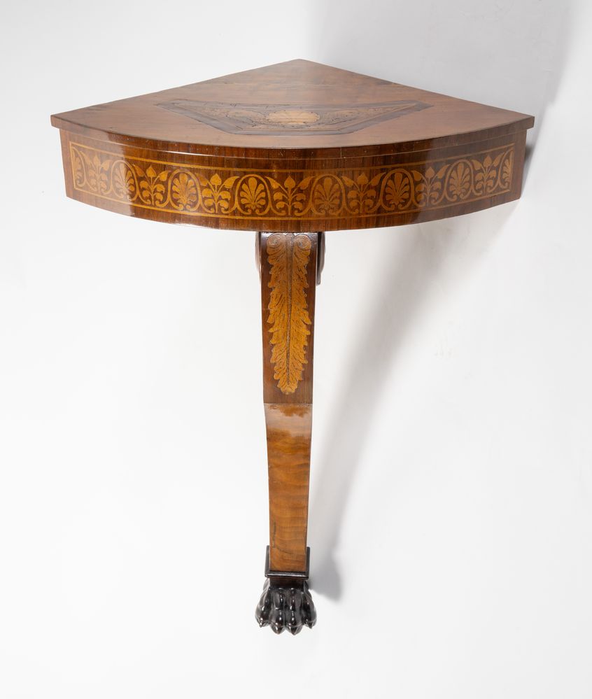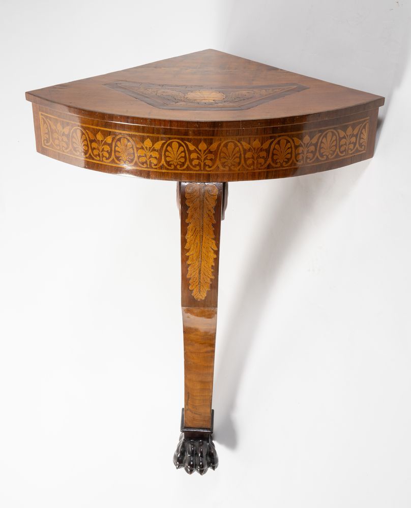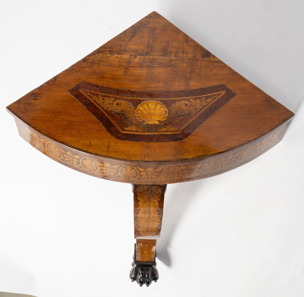 Piccola consolle ad angolo, realizzato in legno di ciliegio con motivo sul piano intarsiati a delfino e conchiglia. Liguria, inizi del XIX secolo. Fascia lastronato con motivi ad intarsio di palmette. Sostegno arcuato con intarsio a foglia d'acanto, poggiante su zampa felina ebanizzata. Cm 76x61,2x45.