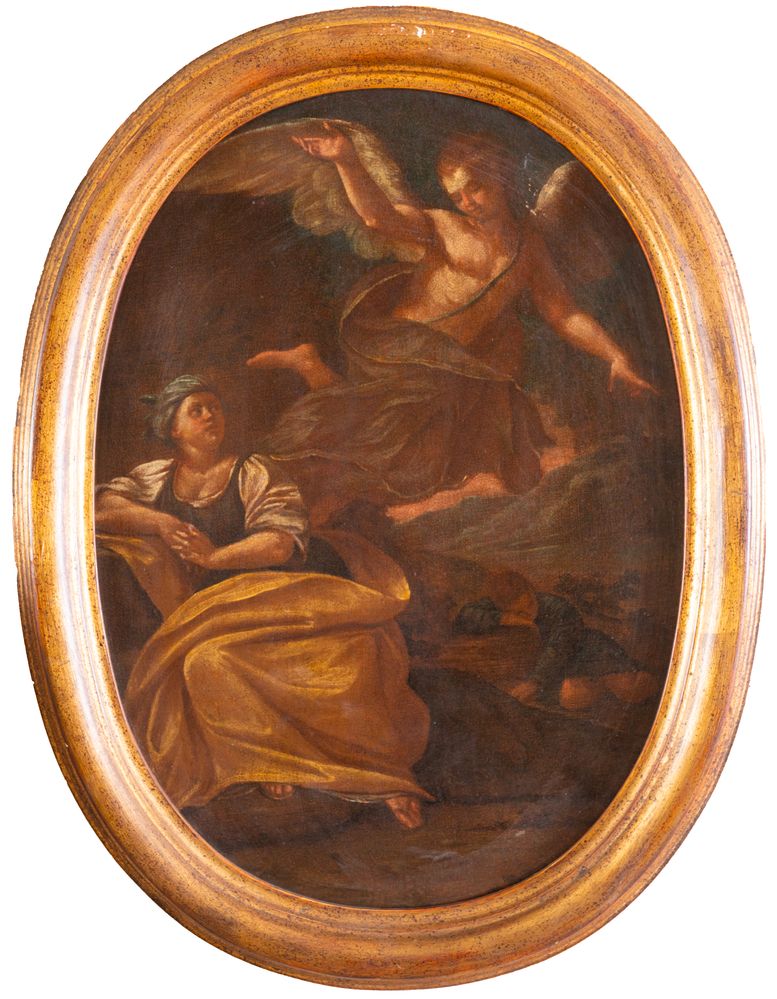 Maestro del XVIII secolo. "Agar e l'Angelo" e "Sacrificio di Isacco". Coppia di olii su tela ovale. Cadauno di cm 50x37.