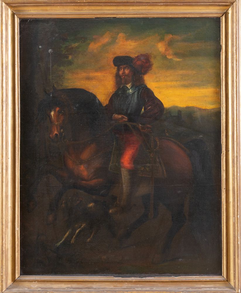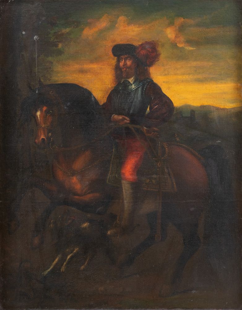 Maestro nordico del XVIII secolo. "Ritratto di uomo a cavallo". Cm 108x89.5. (restauri)