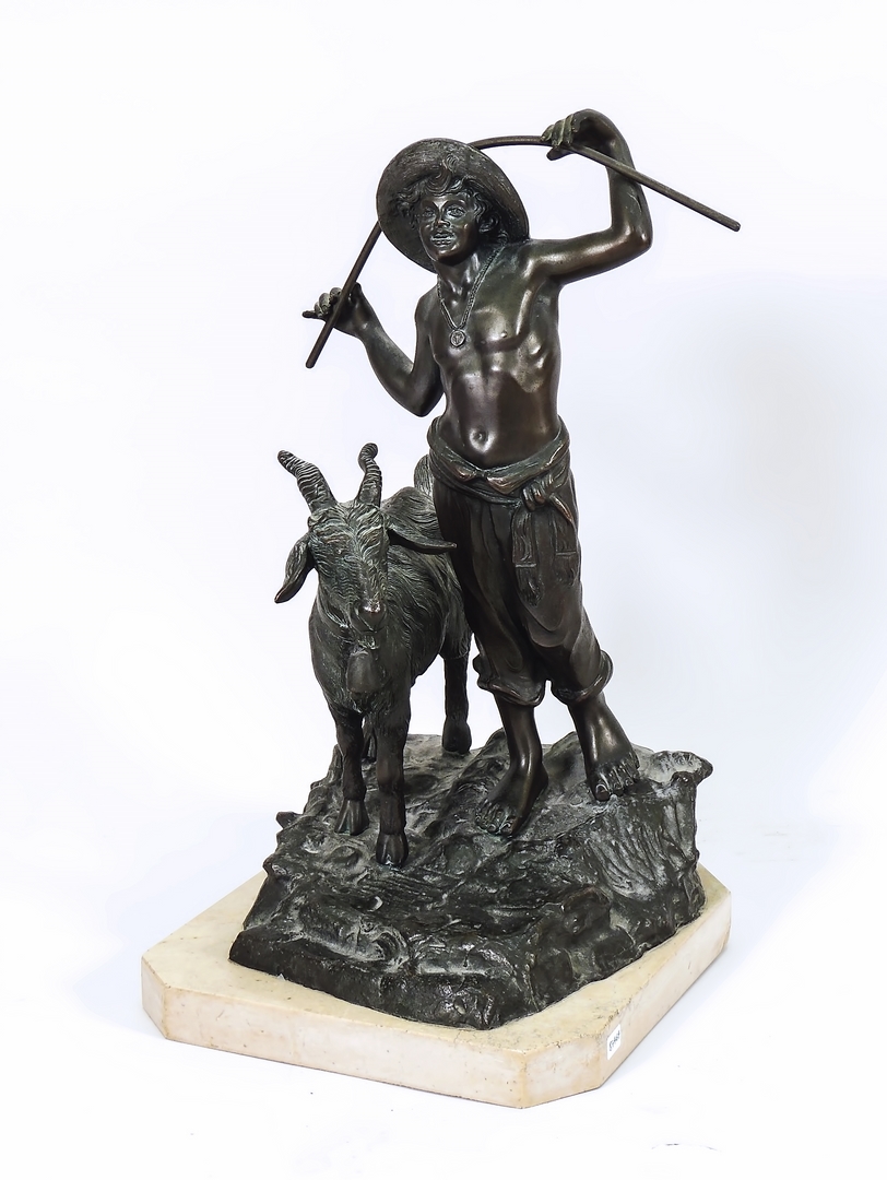 GRUPPO IN METALLO - METAL FIGURAL GROUP raffigurante un Pastorello con capra su base in marmo, firmata e datata 1920 h cm 46