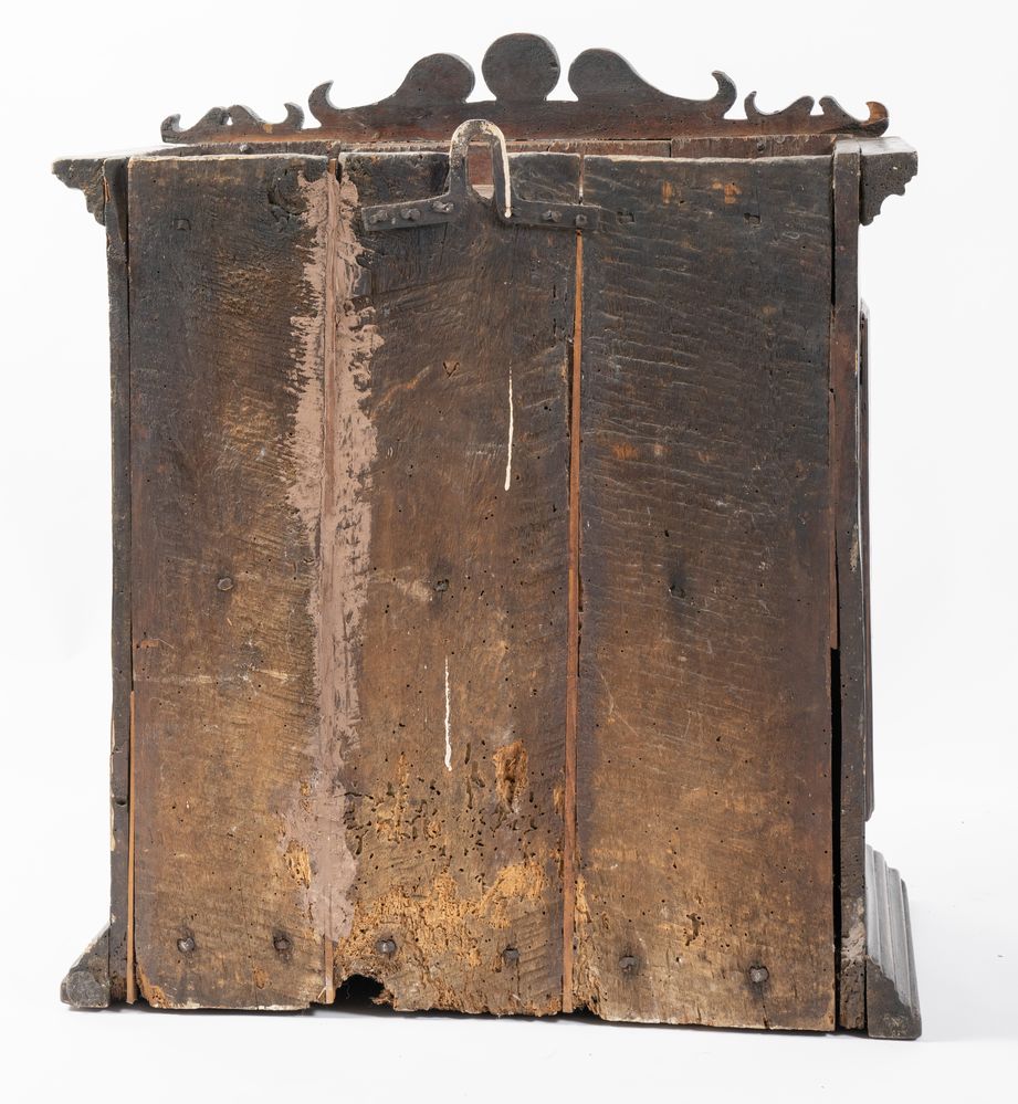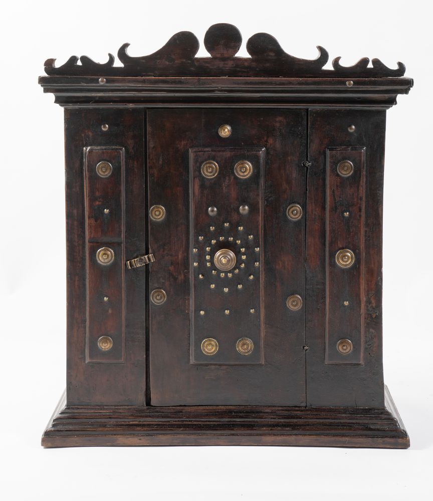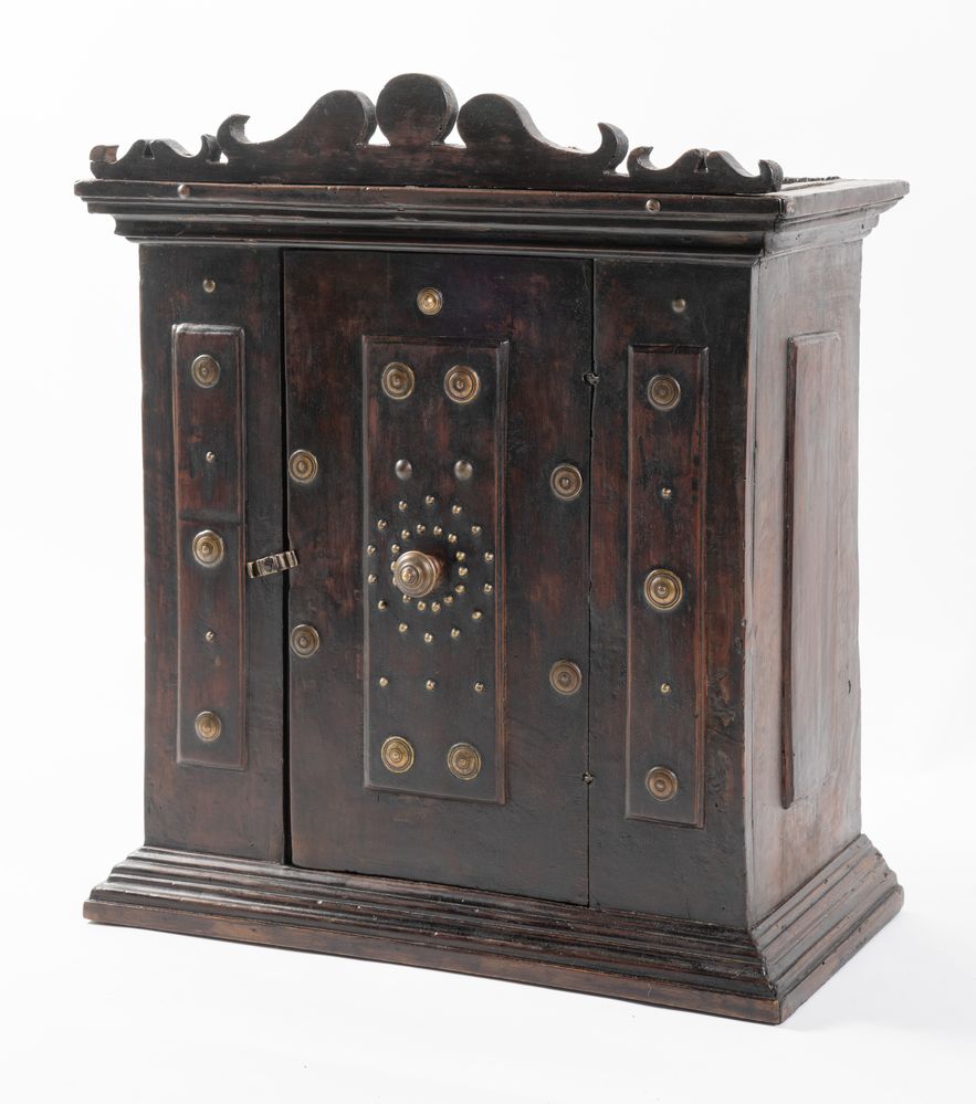 Stipo pensile in legno di noce con borchiatura in bronzo. Emilia, XVII secolo. Il fronte si contraddistingue per uno sportello bugnato con due pilastrate e fianchi bugnati. Alla base e alla sommità presenta cornicione modanato mistilineo e cimasa di foggia barocca. Cm 77x67,5x36.