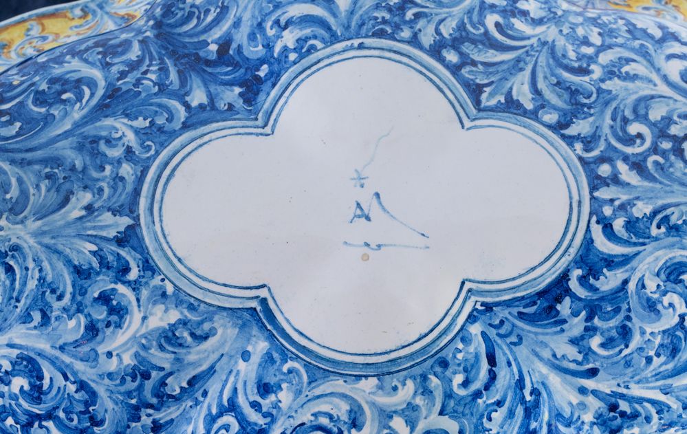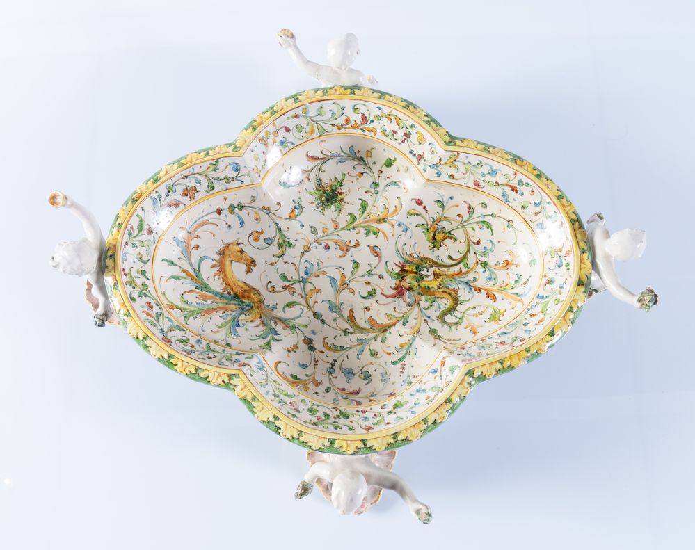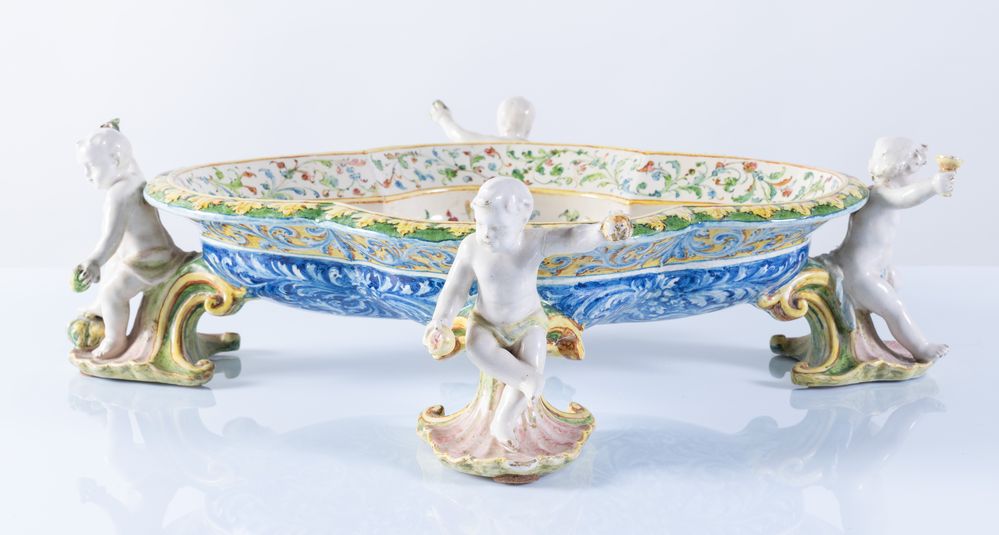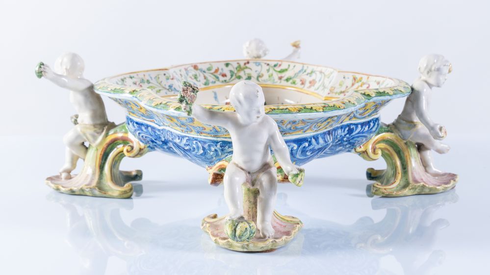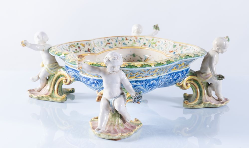 ANGELO MINGHETTI (1822-1885), 1900 ca. Grande centrotavola in ceramica policroma smaltata di forma polilobata. Decorata a motivi floreali, poggia alle quattro basi su figure di putti. Cm 16x55x45. Opera firmata alla base AM *. Provenienza: importante collezione privata, Pesaro. (lievi difetti)