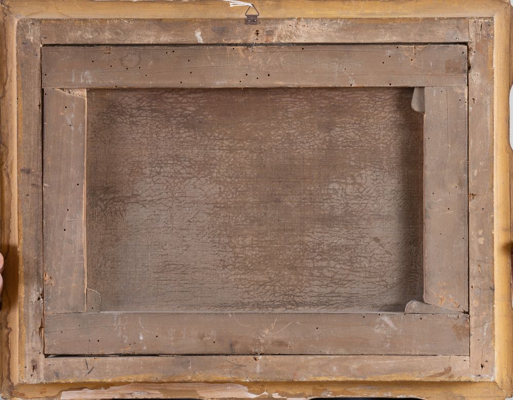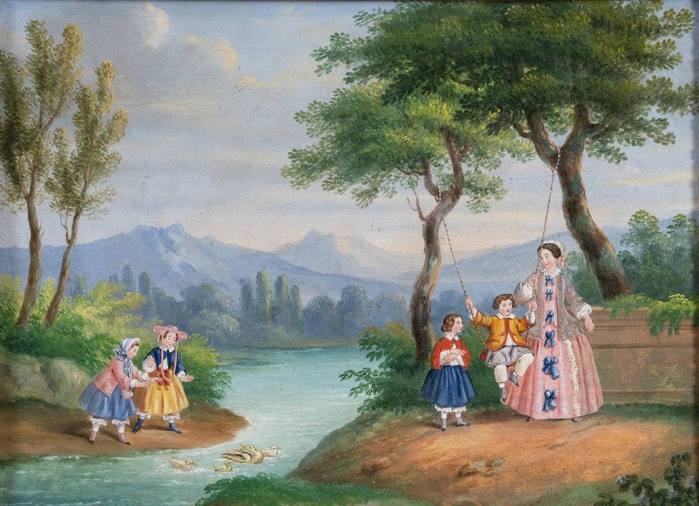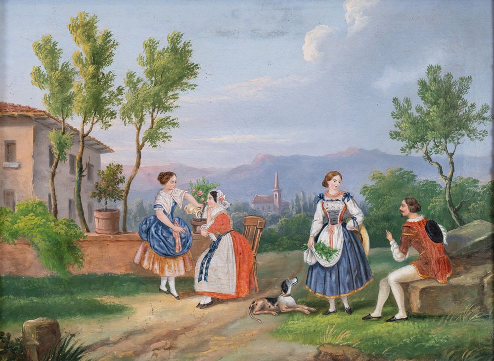Maestro della prima metà del XIX secolo. ”Paesaggi con figure”. Lotto composto da quattro dipinti, olio su tela. Cadauna di cm 34,5x47. Cornici coeve.