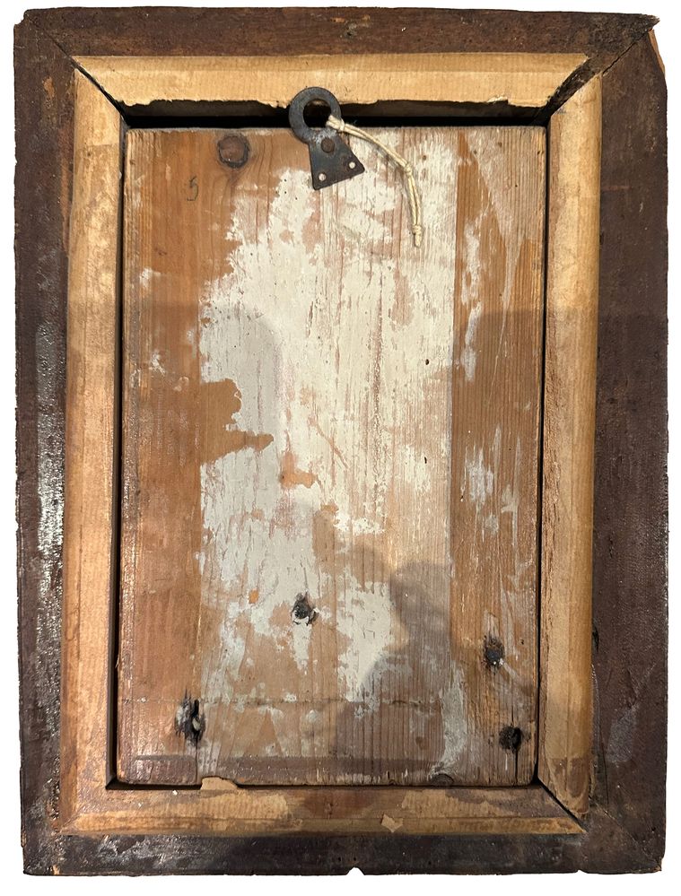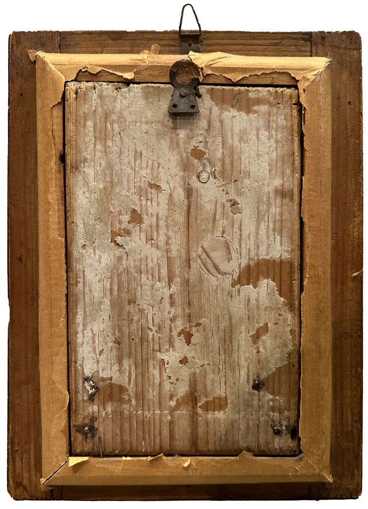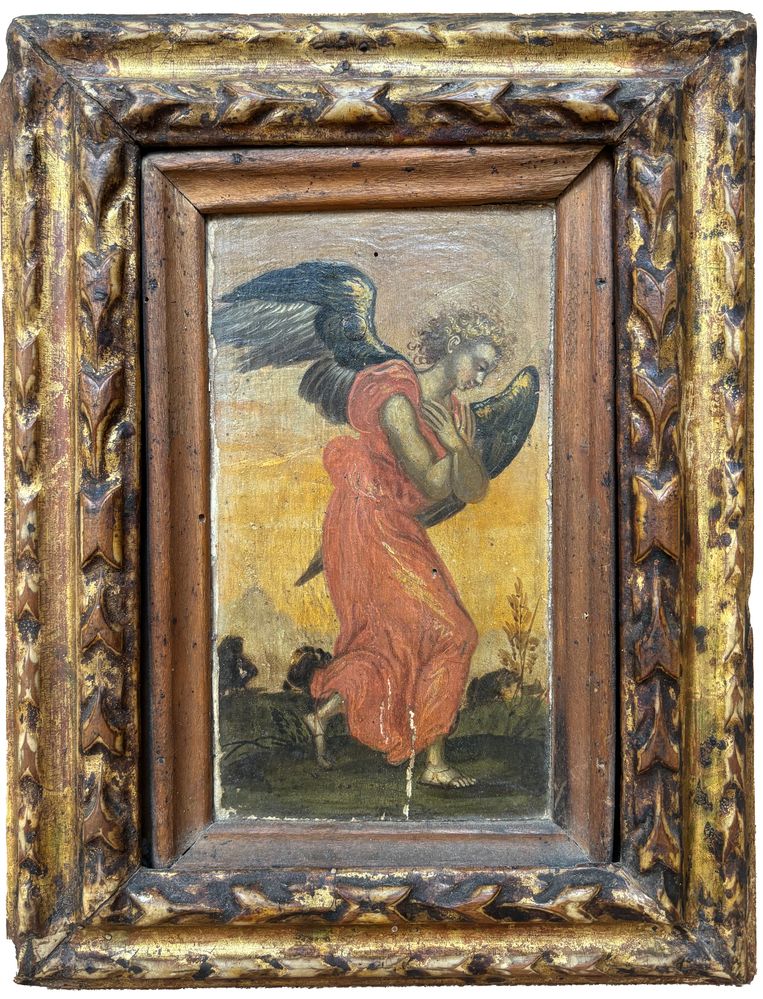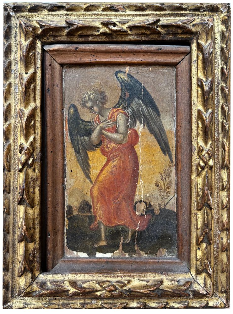 Maestro veneto-cretese del XVI secolo. "Angeli". Coppia di tempere su tavola. Cornici antiche. Cadauno cm 24x15.