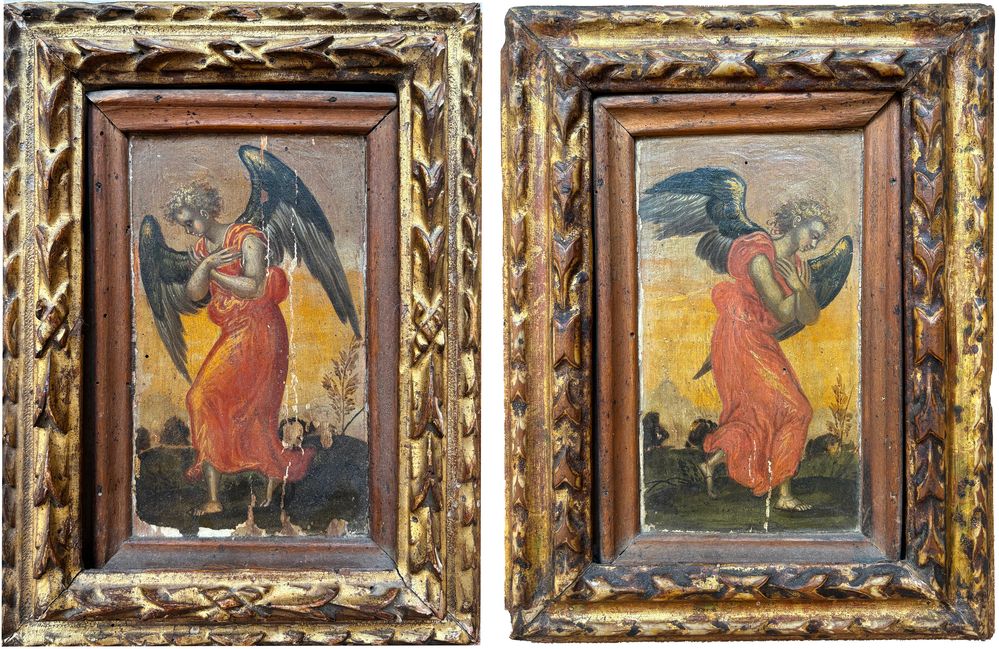 Maestro veneto-cretese del XVI secolo. "Angeli". Coppia di tempere su tavola....