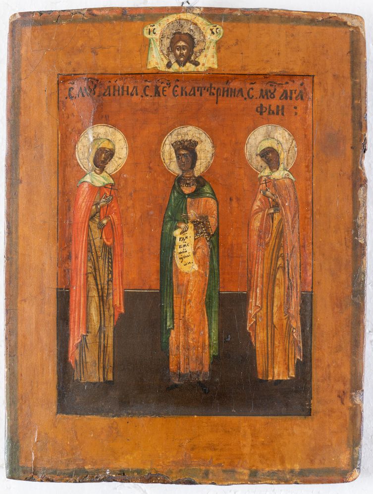 Icona raffigurante Santa Caterina e due sante a lato. Russia, seconda metà...