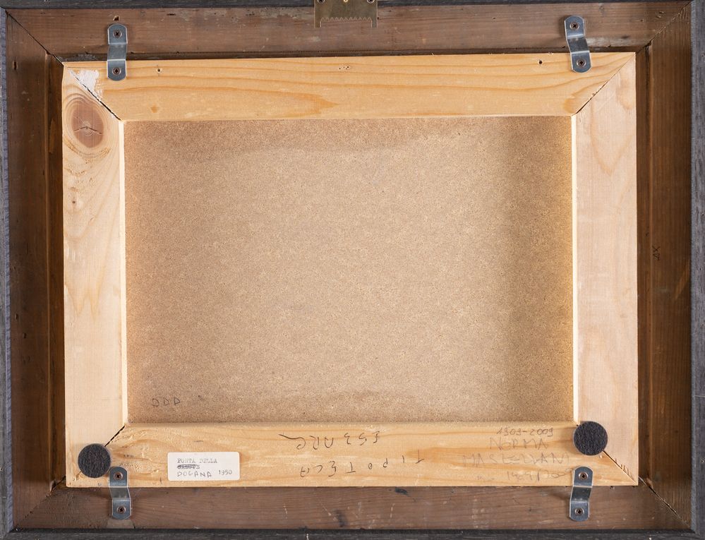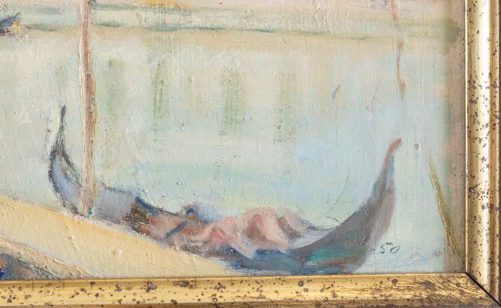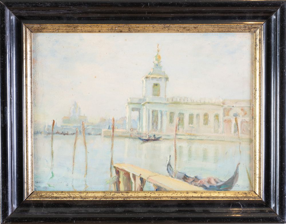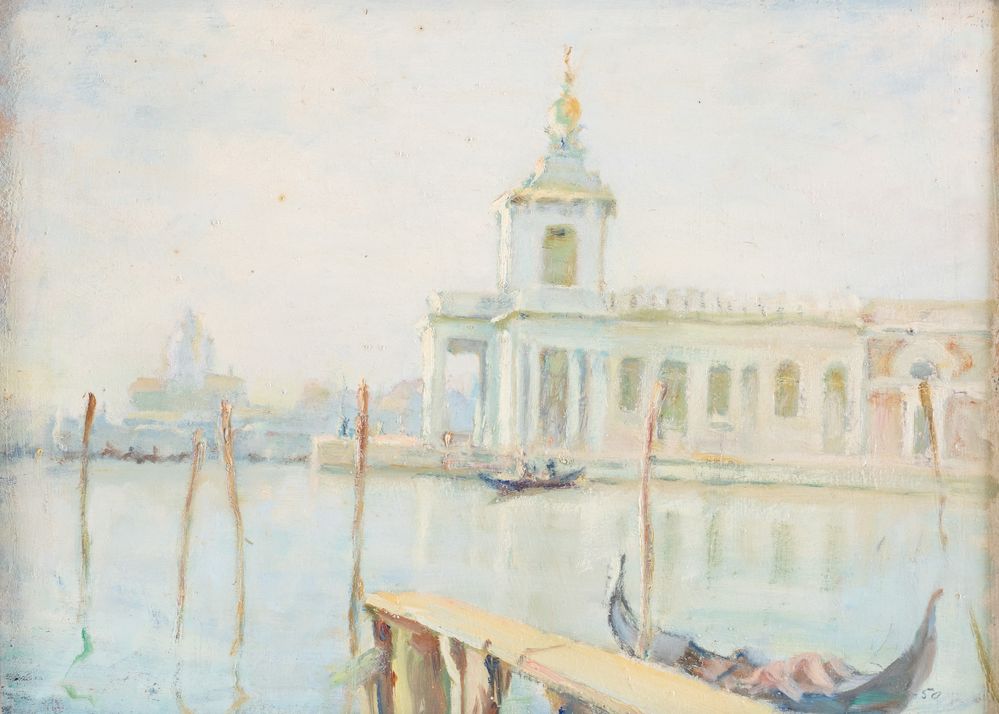 NORMA MASCELLANI (Bologna 1909 - 2009) "Punta della Dogana", 1950. Olio su cartone. Cm 30x40. Opera firmata e datata in basso a destra. Firma sbiadita. Al retro reca etichetta.