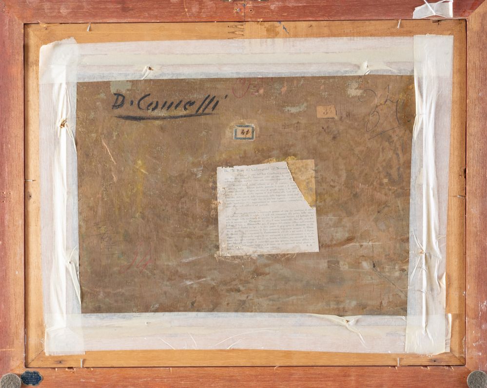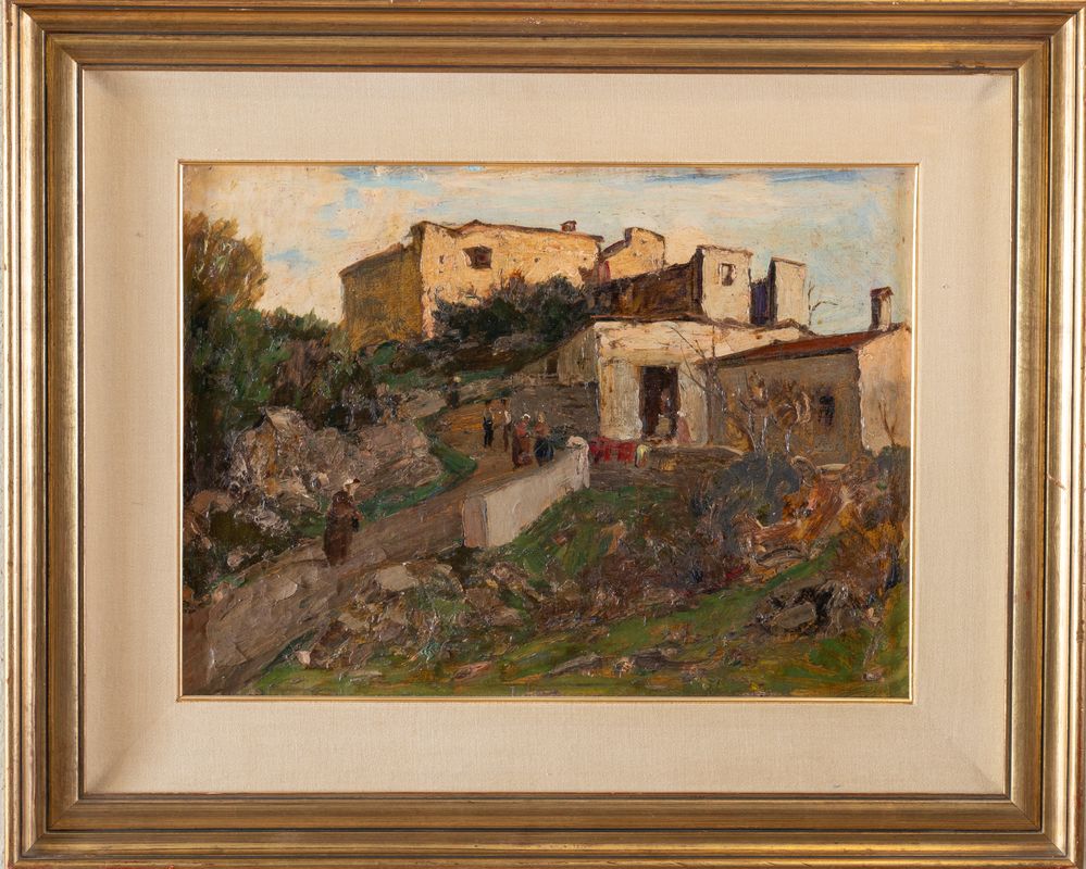 DANTE COMELLI (Bologna 1880 - 1958) "Paesaggio con case". Olio su tavola. Cm 34x45. Al retro opera firmata D. Comelli con i timbri di partecipazione alla mostra ed estratto del Resto del Carlino attinente a detta mostra. (difetti)