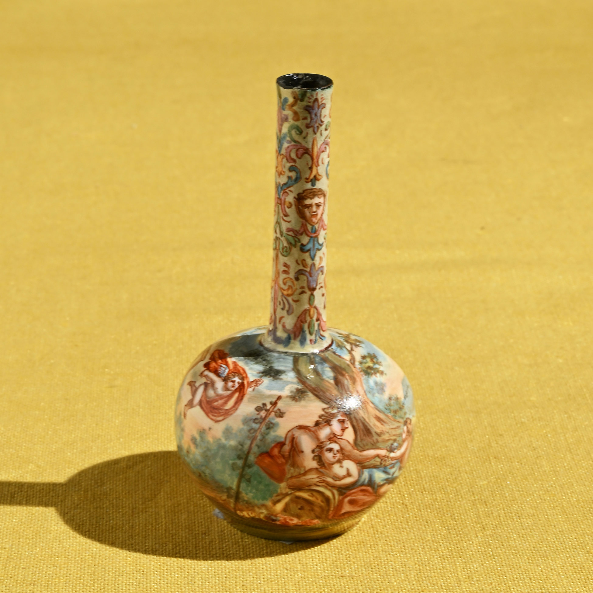 Piccolo vaso in smalto, Vienna XIX secolo Decorato a motivi di mascheroni, festoni e scene classicheggianti. Dimensioni complessive 9x4,5x4,5 cm.
