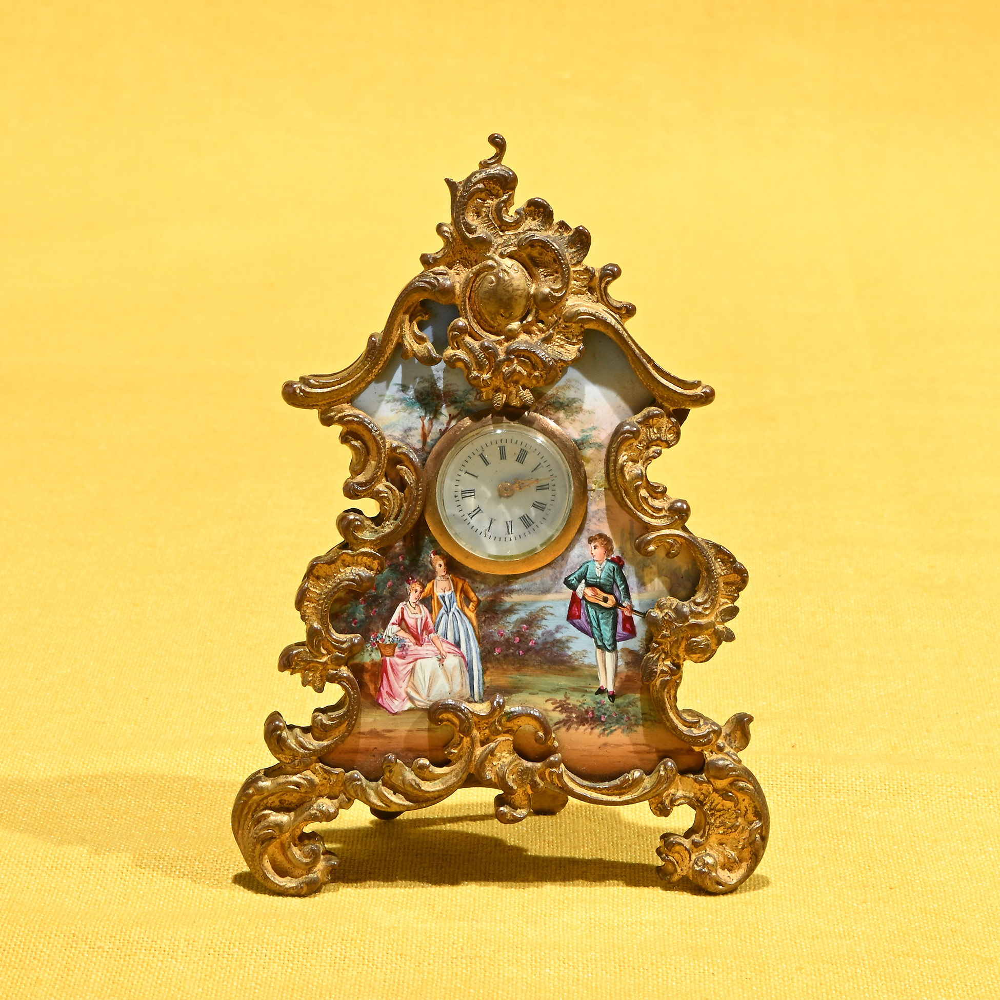 Orologio da tavolo in smalto e bronzo dorato, Vienna XIX secolo Scena centrale raffigurante una scena galante. Dimensioni complessive 10x7,5x3,5 cm.