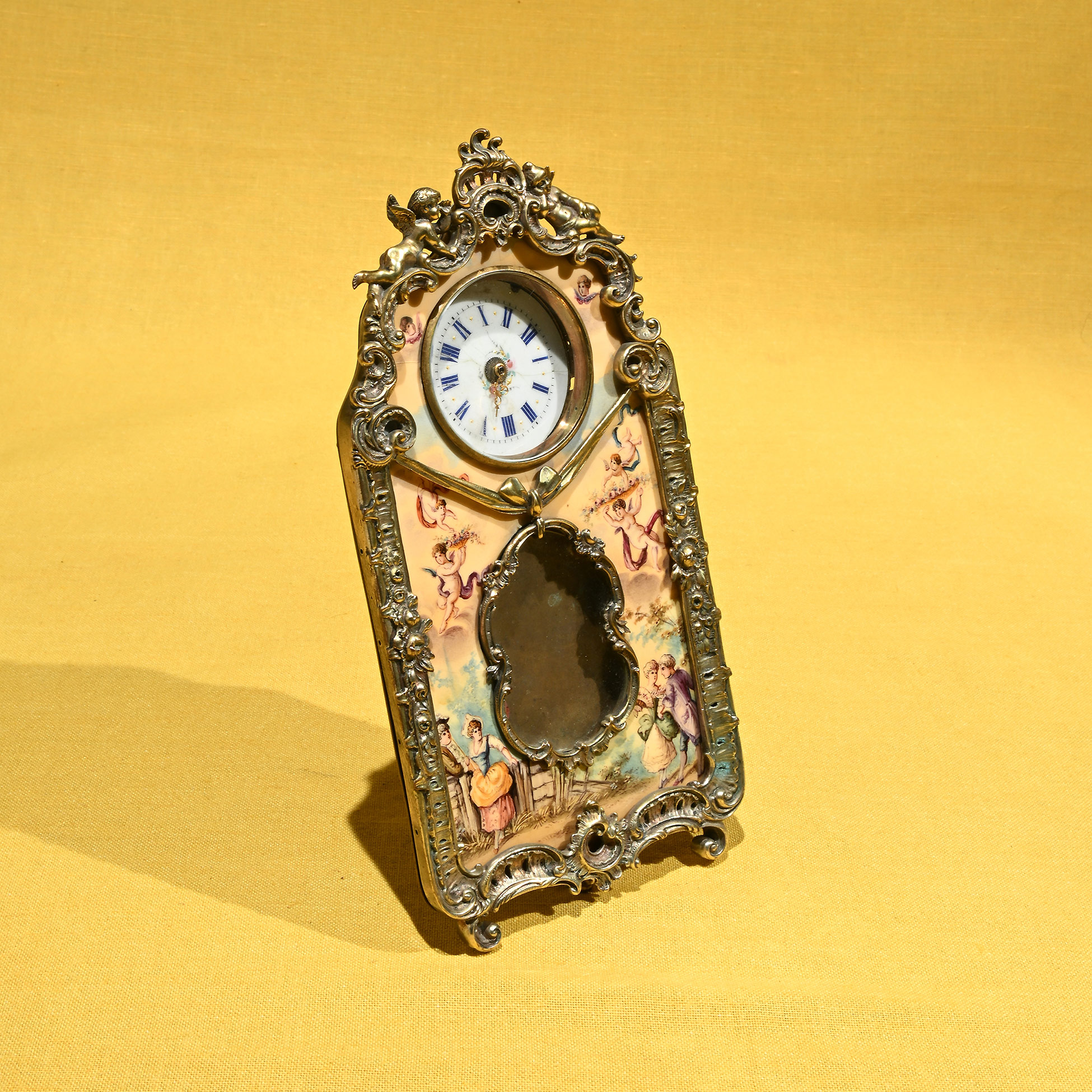 Orologio da tavolo in smalto e bronzo dorato, Vienna XIX secolo Scena centrale raffigurante una scena galante con putti. Dimensioni complessive 20x10x7,5 cm.