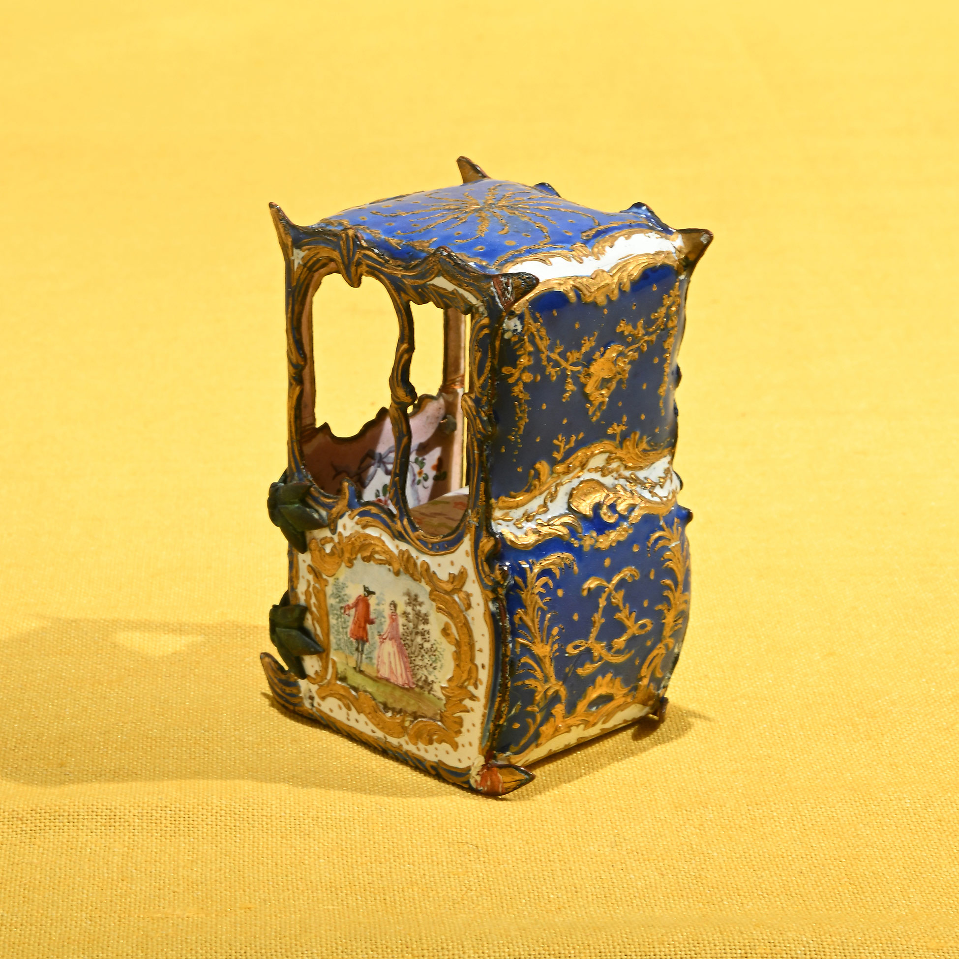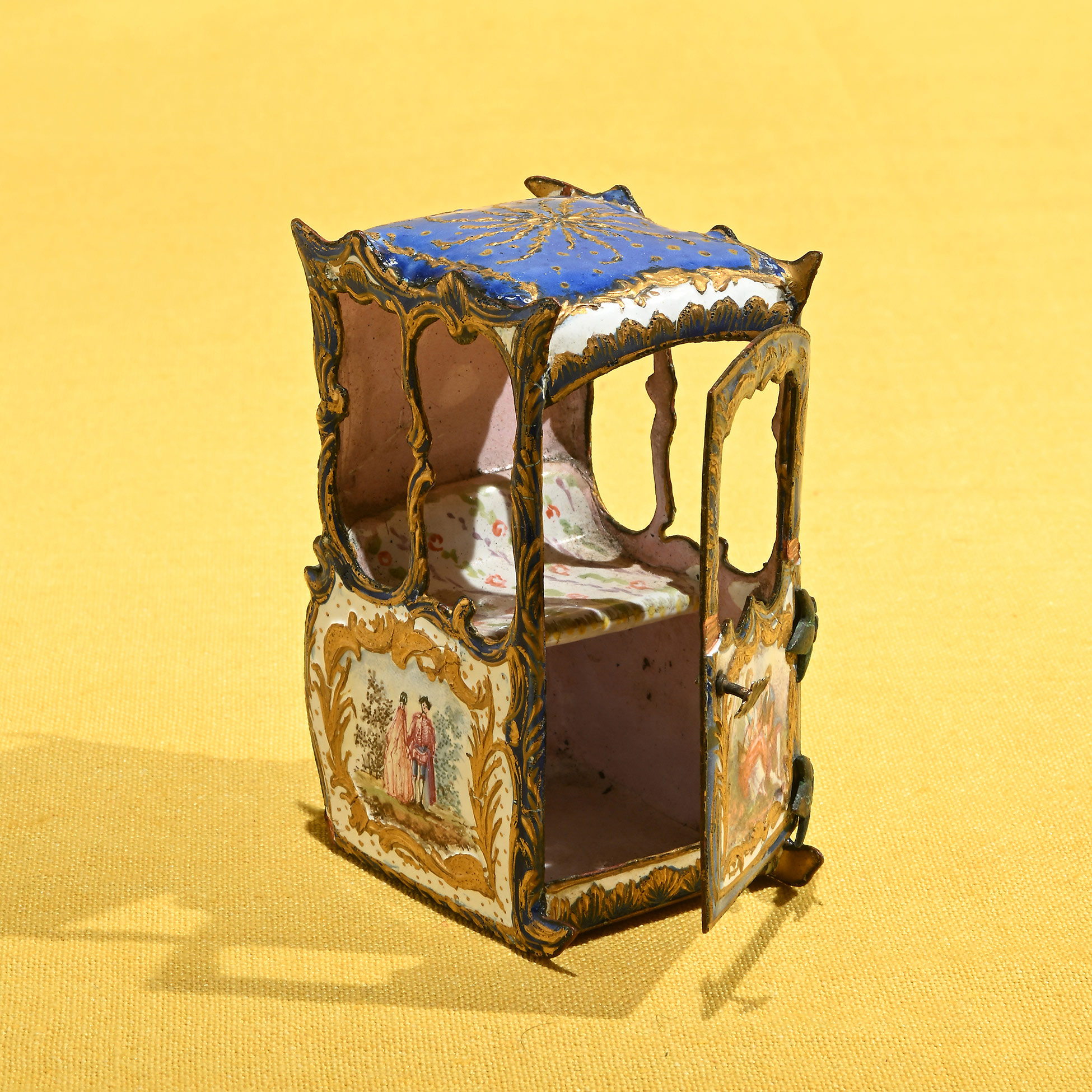 Portantina in bronzo dorato e smalto, Vienna fine XIX secolo Decorata a motivi di vegetali e con scene galanti, dotata di sportello. Dimensioni complessive 7,5x5x4 cm.