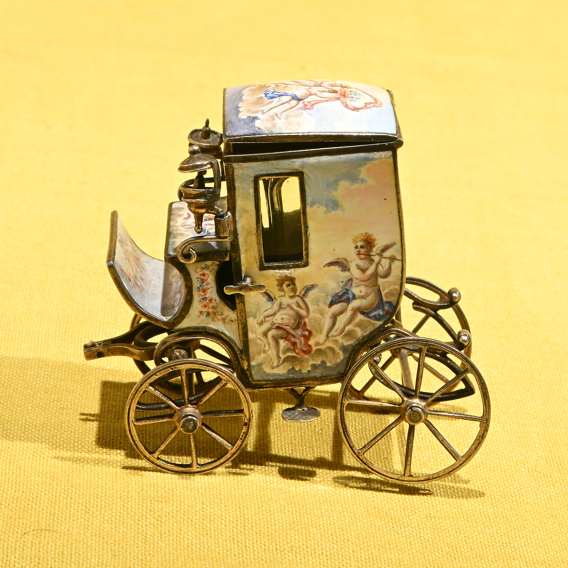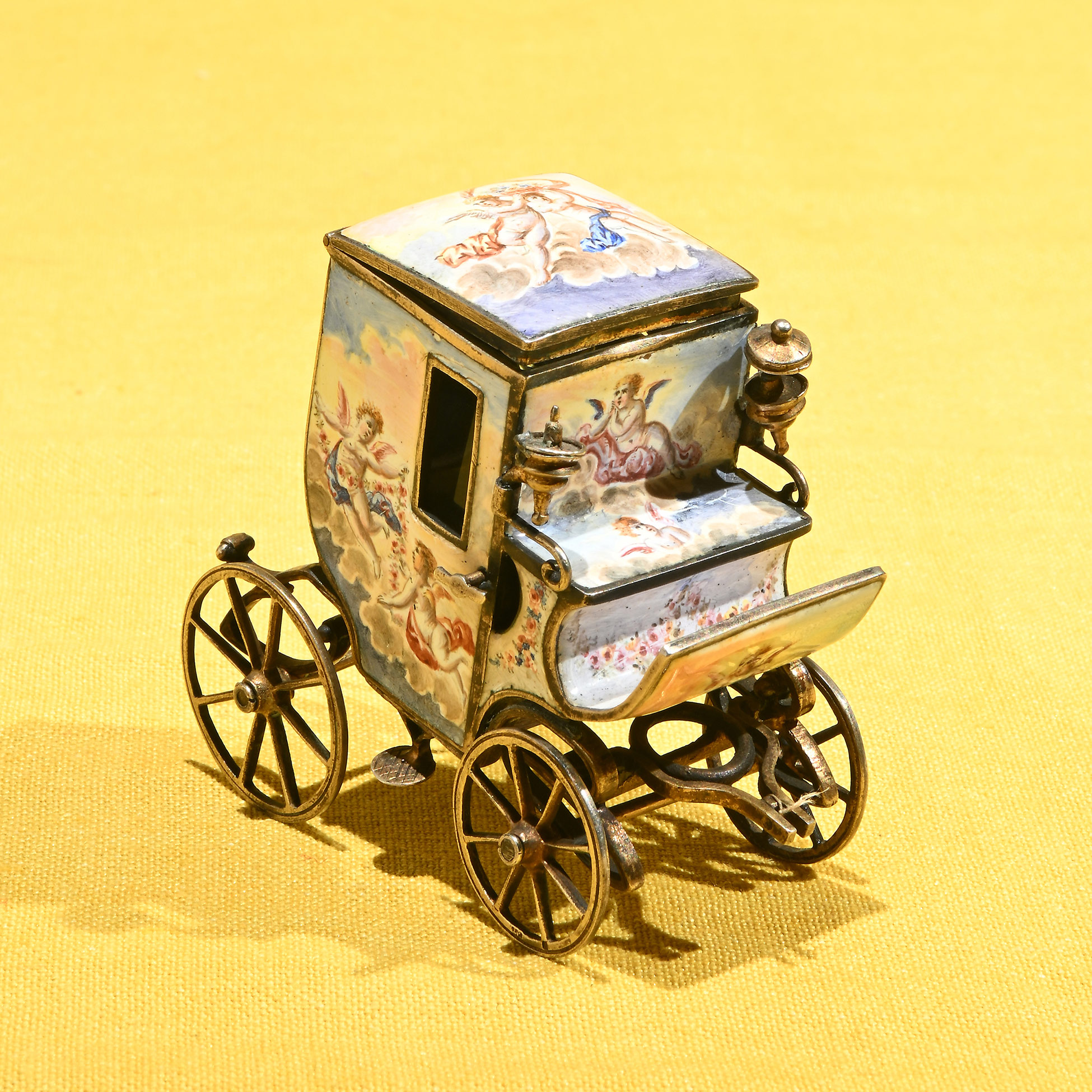 Carrozza in bronzo dorato e smalti, Vienna fine XIX secolo Decorata a motivi di scene galanti, con coperchio e recipiente interno in vetro. Dimensioni complessive 6,5x7x3 cm.