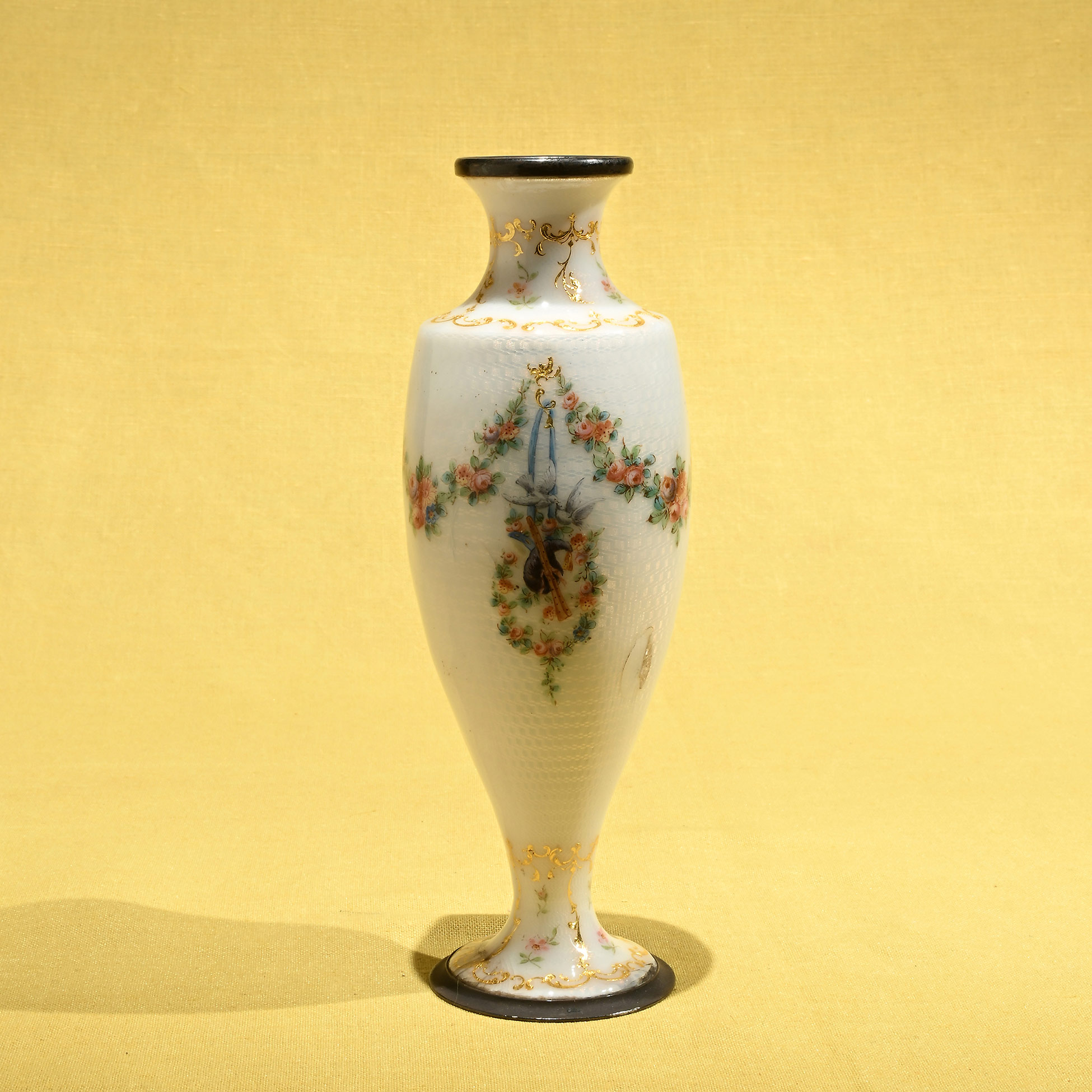 Vaso in smalto, Francia fine del XIX secolo Decorato con smalti guilloche, festoni, ghirlande e strumenti musicali. Dimensioni complessive 21x7x7 cm.