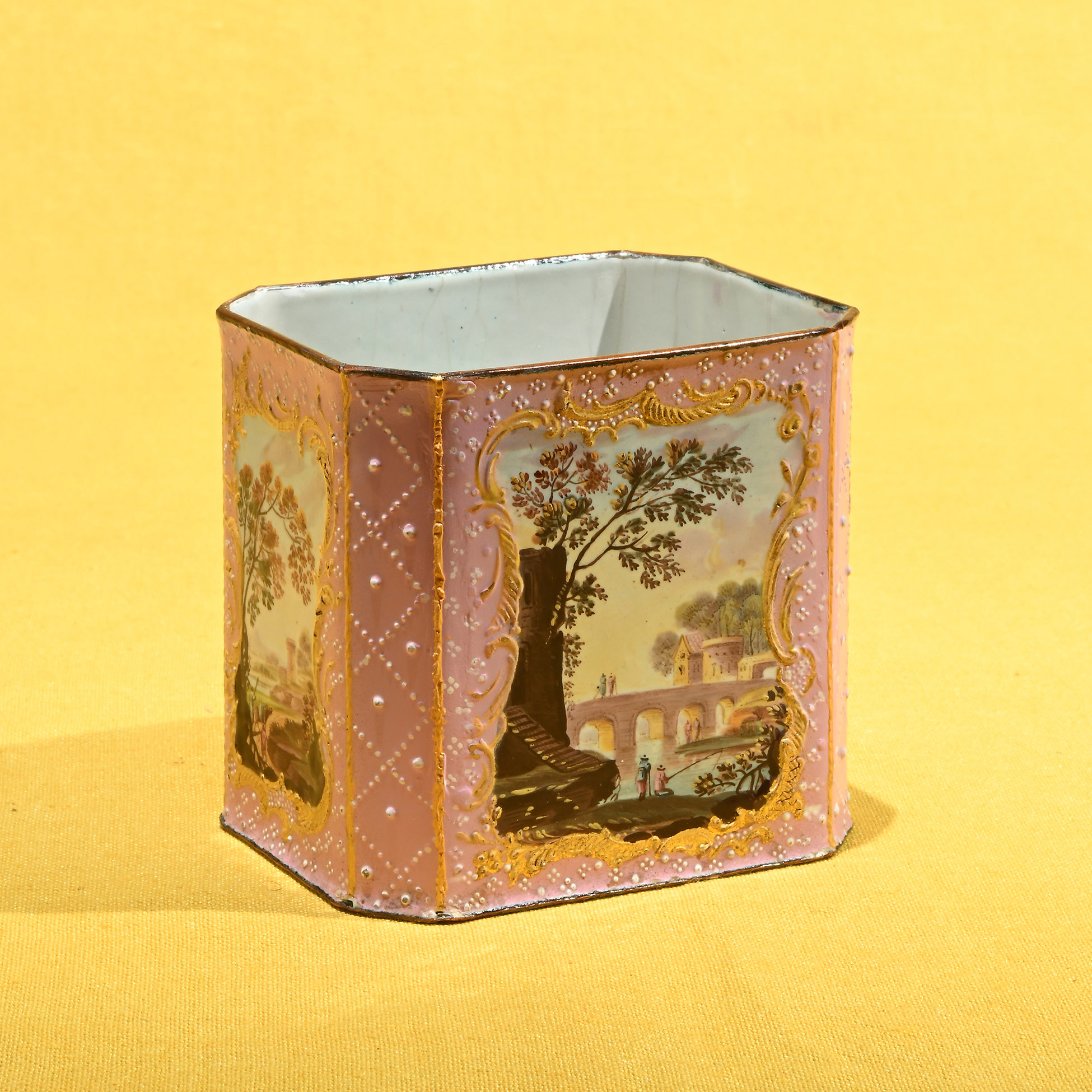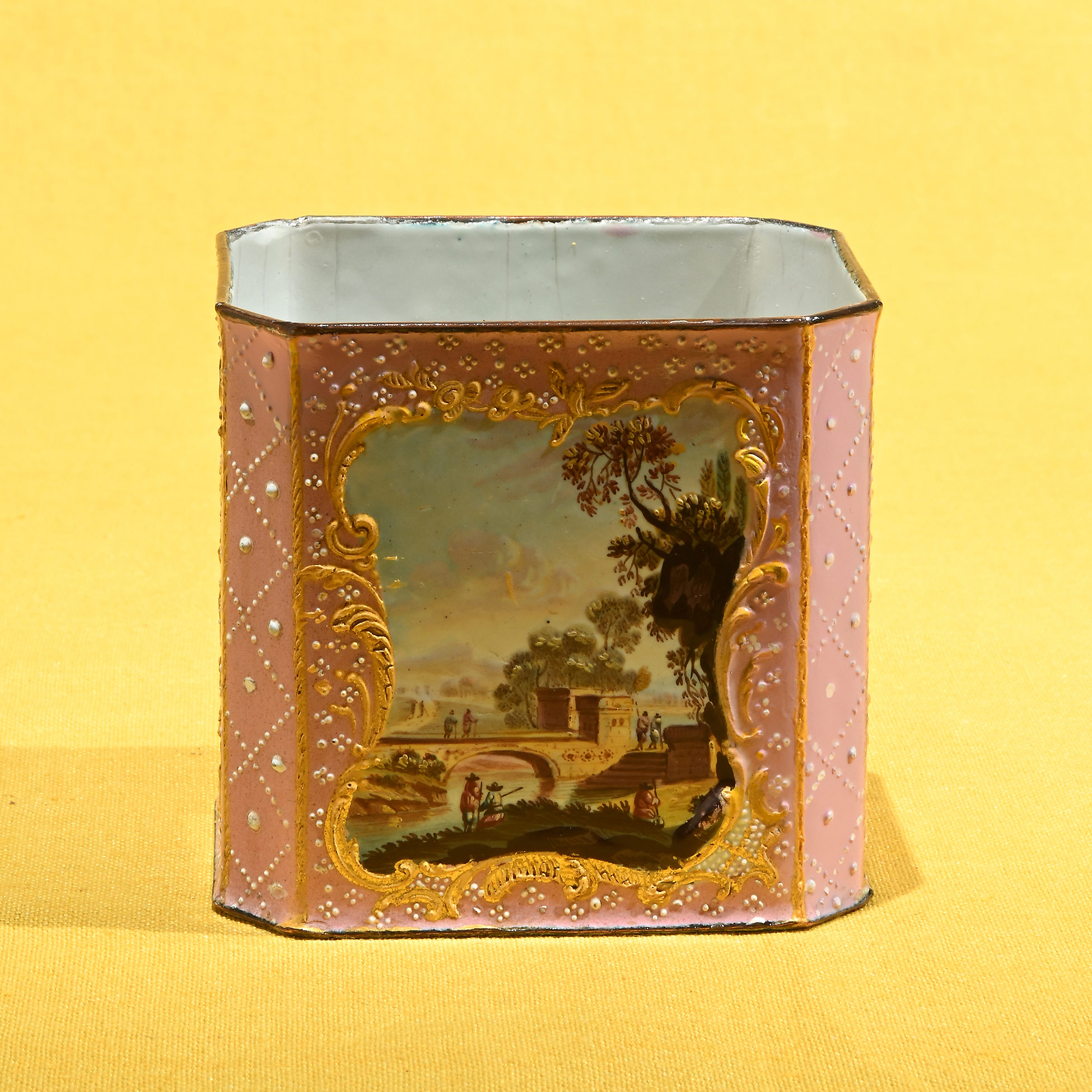 Contenitore in smalto, Battersea XVIII secolo Decorato a motivi astratti in bianco e oro su fondo rosa e con quattro scene di paesaggio con figure. Dimensioni complessive 8x8,5x6,5 cm.