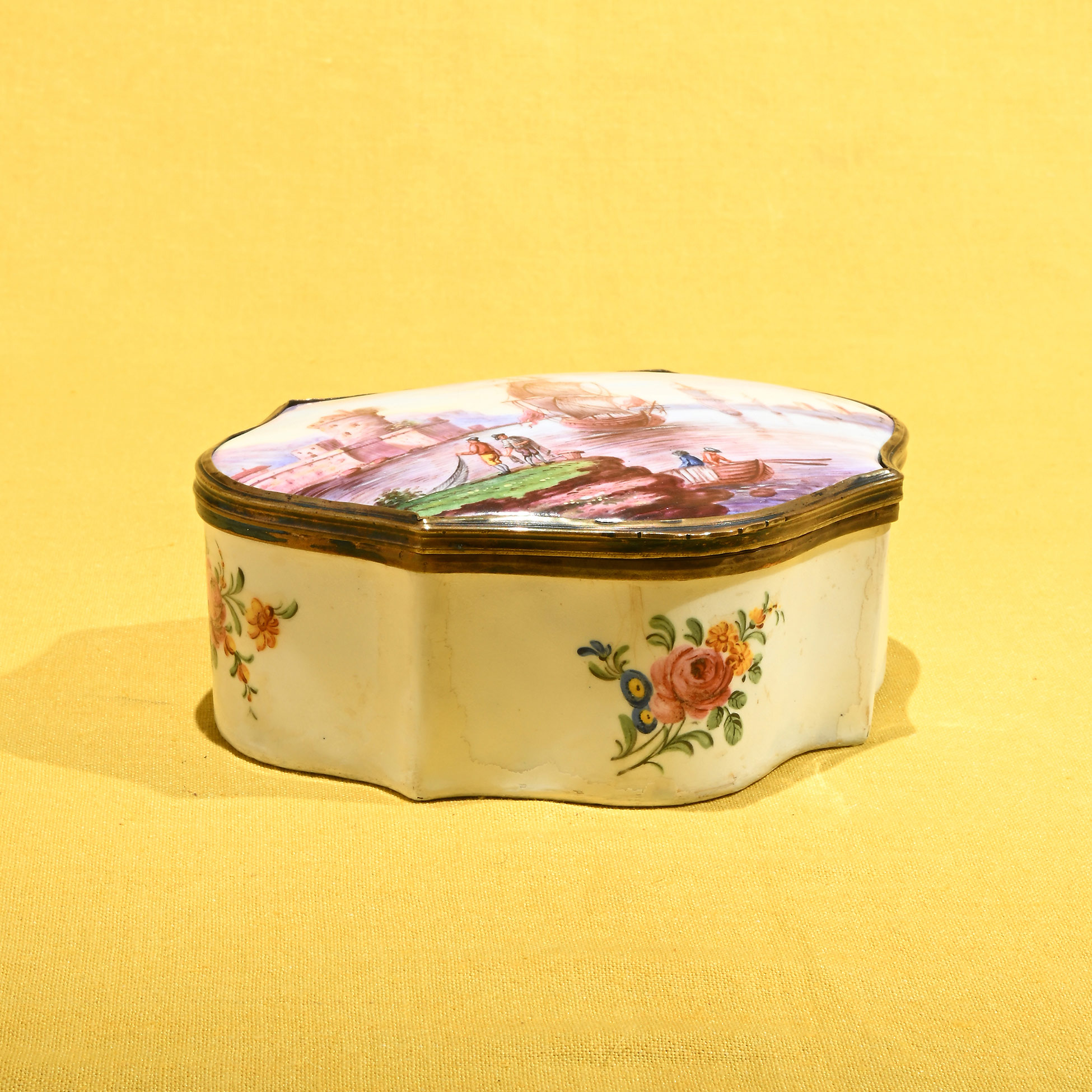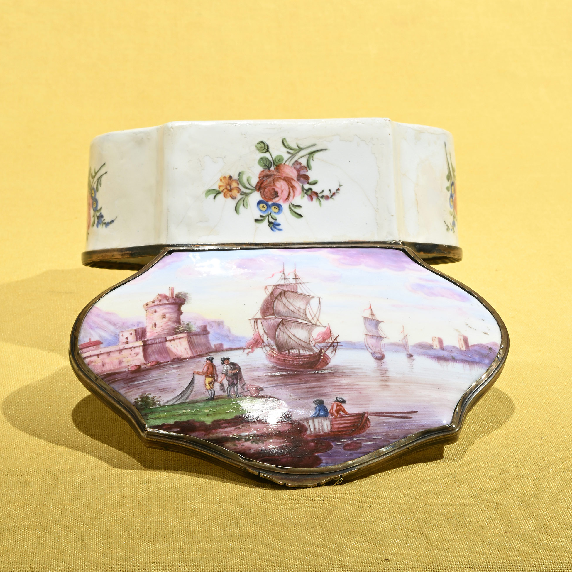 Cofanetto in smalto, Inghilterra XVIII secolo Decorato a motivi di fiori su fondo bianco, sul coperchio è dipinto un paesaggio portuale con pescatori. Dimensioni complessive 5,5x14x11,5 cm.