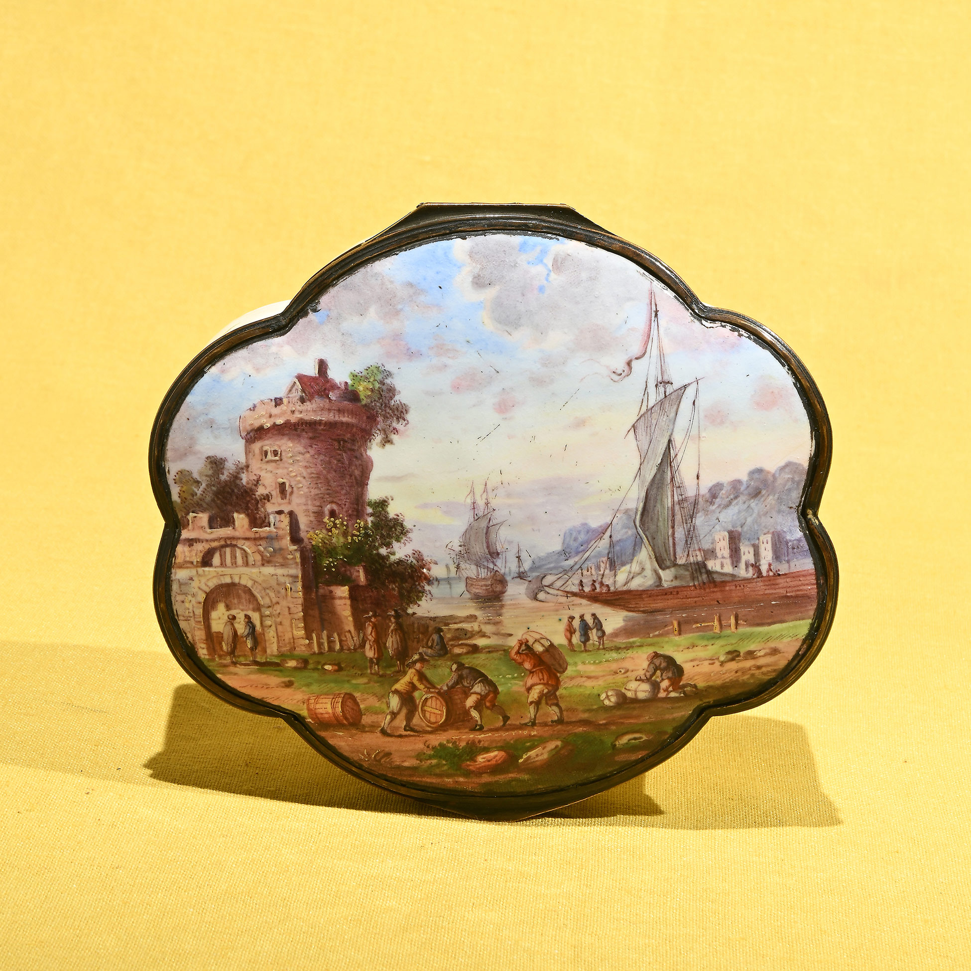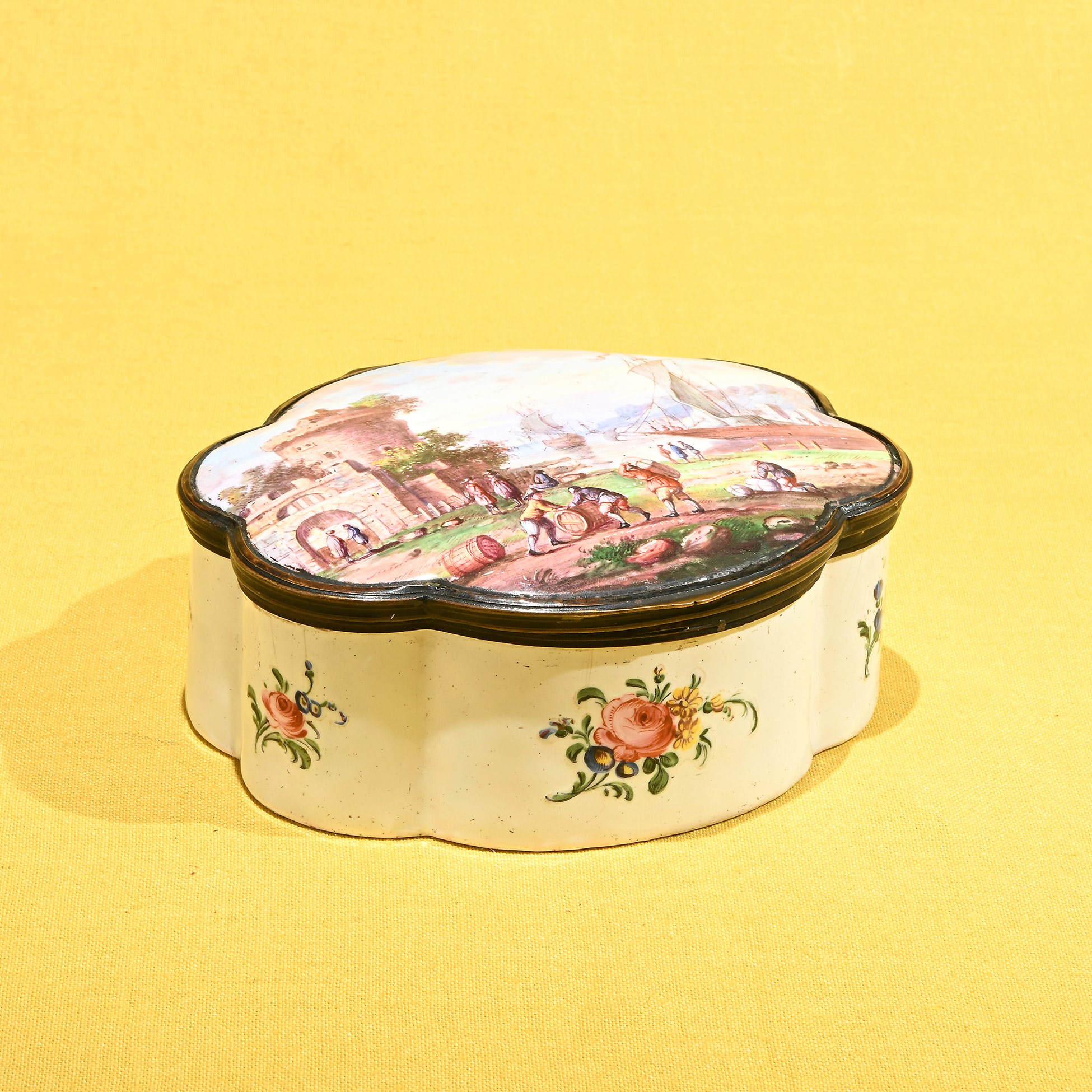 Cofanetto in smalto, Inghilterra XVIII secolo Decorato a motivi di fiori su fondo bianco, sul coperchio è dipinto un paesaggio portuale con figure. Dimensioni complessive 5,5x12,5x13,5 cm.