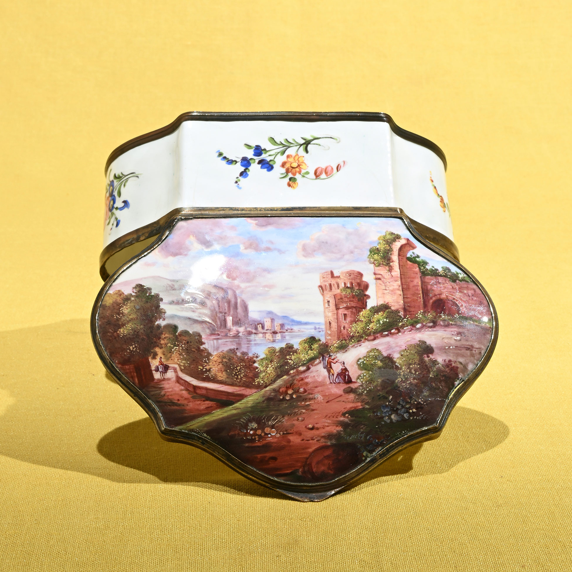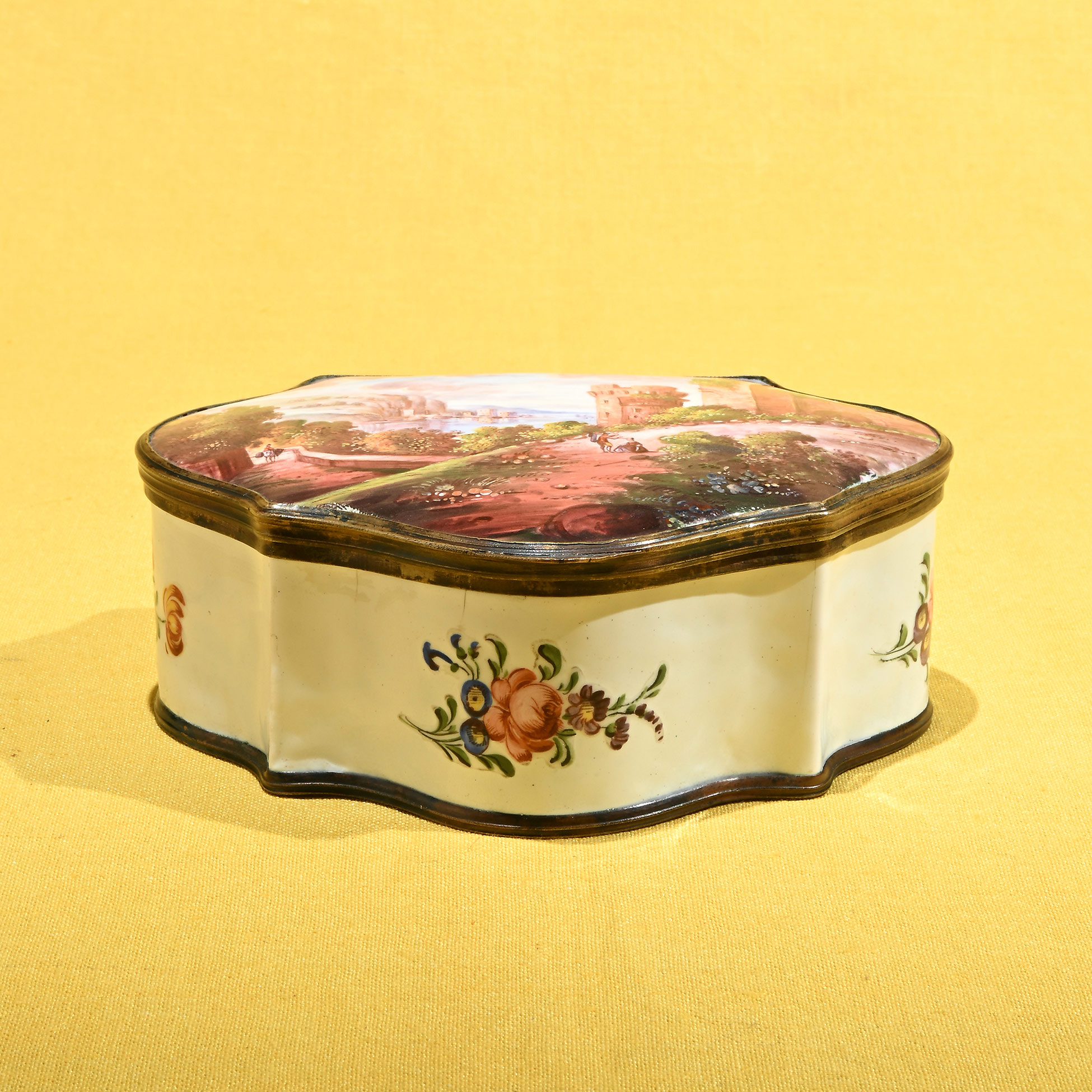 Cofanetto in smalto, Germania XIX secolo Decorato a motivi di fiori su fondo bianco, sul coperchio è dipinto un paesaggio con figure. Dimensioni complessive 5x14,5x11 cm.