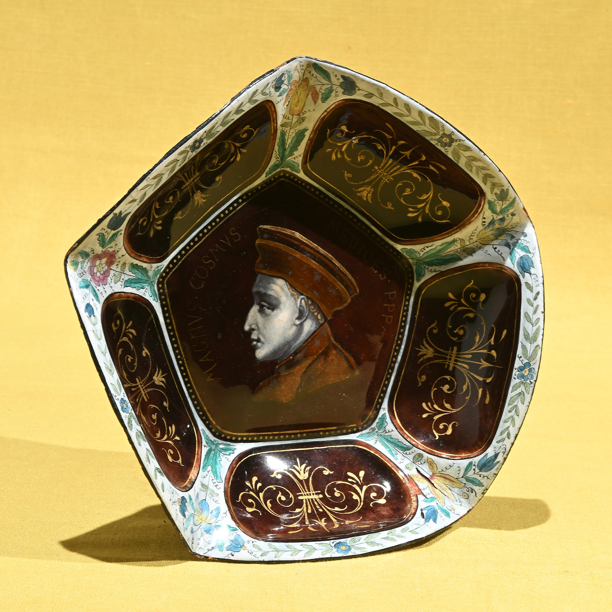 Centro pentagonale in smalto, Limoges XIX secolo Decorazione centrale con raffigurato il profilo di Cosimo de Medici e decori a motivi astratti e di vegetali. Dimensioni complessive 4x18x18 cm.