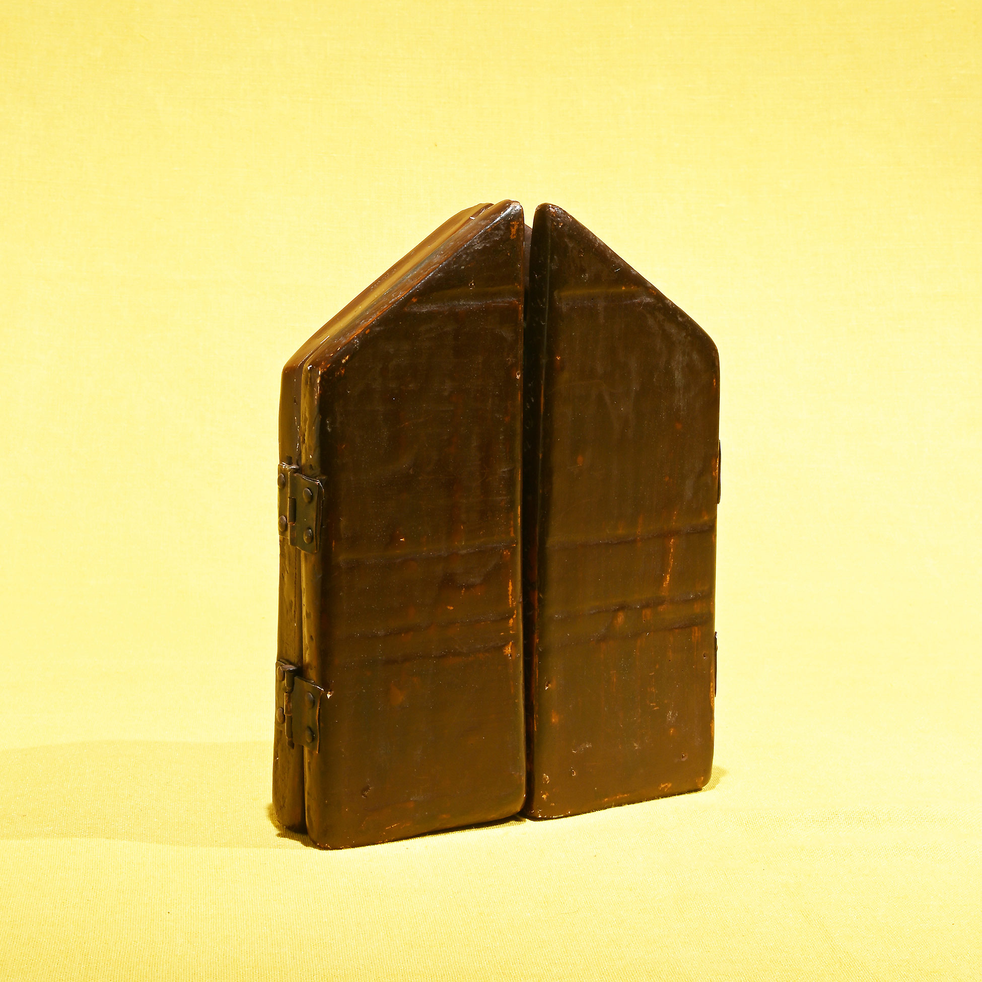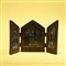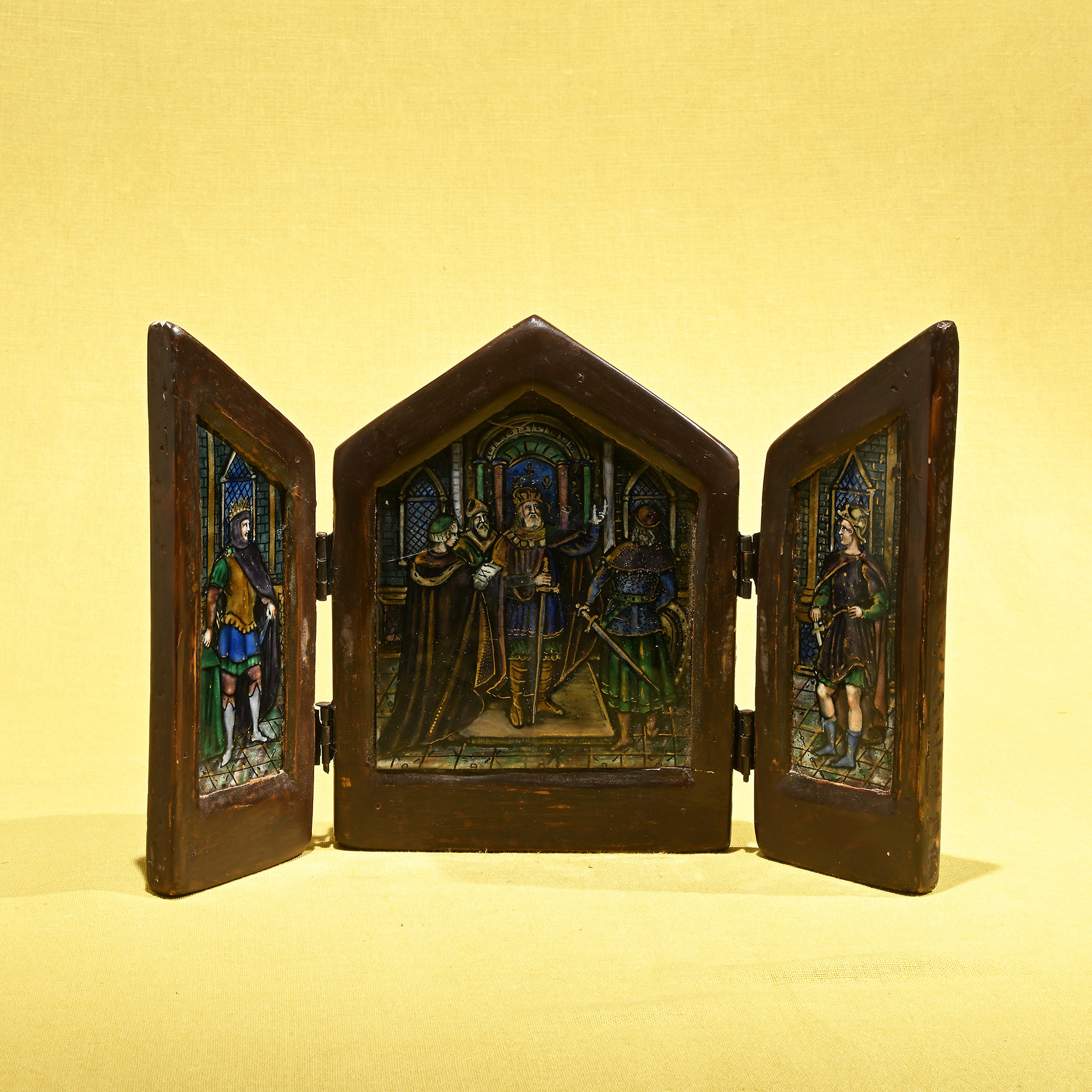 Trittico in legno e smalto, Limoges XVIII secolo Sul pannello centrale raffigurato un re accompagnato da un vescovo e dei cavalieri; sulle ante laterali due cavalieri. Dimensioni complessive chiuso 18x13,5x3, aperto 18x26x1,5 cm.