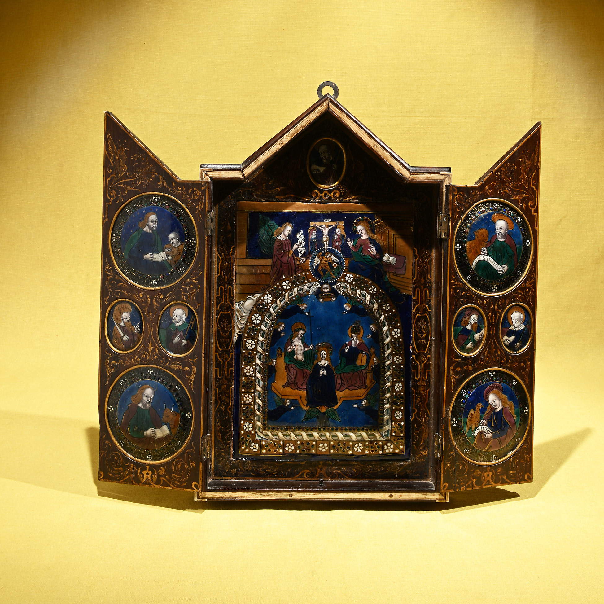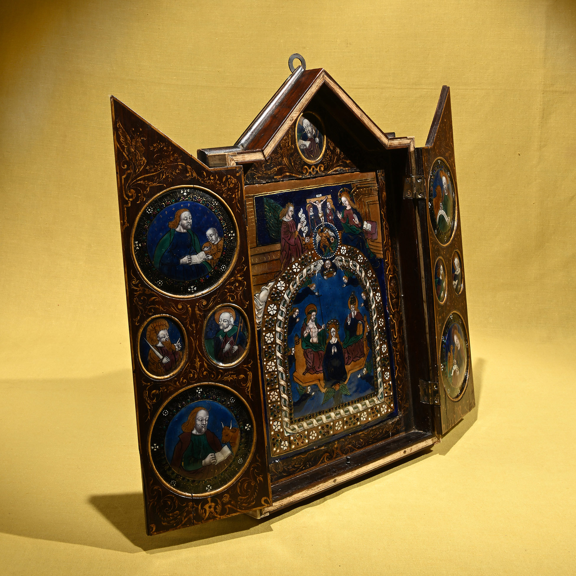 Trittico ad ante in legno e smalti, manifattura limosina del XVII secolo Nelle ante sono raffigurati in quattro tondi gli Evangelisti e in quattro tondi più piccoli quattro Santi. La placca centrale illustra l'Incoronazione di Maria in cielo, e in alto gli episodi dell'Annunciazione e della Crocifissione di Cristo. Dimensioni complessive chiuso 43,5x26x4, aperto 44x47x5 cm.
