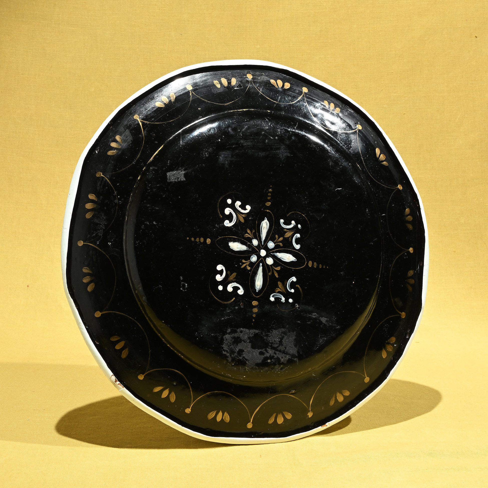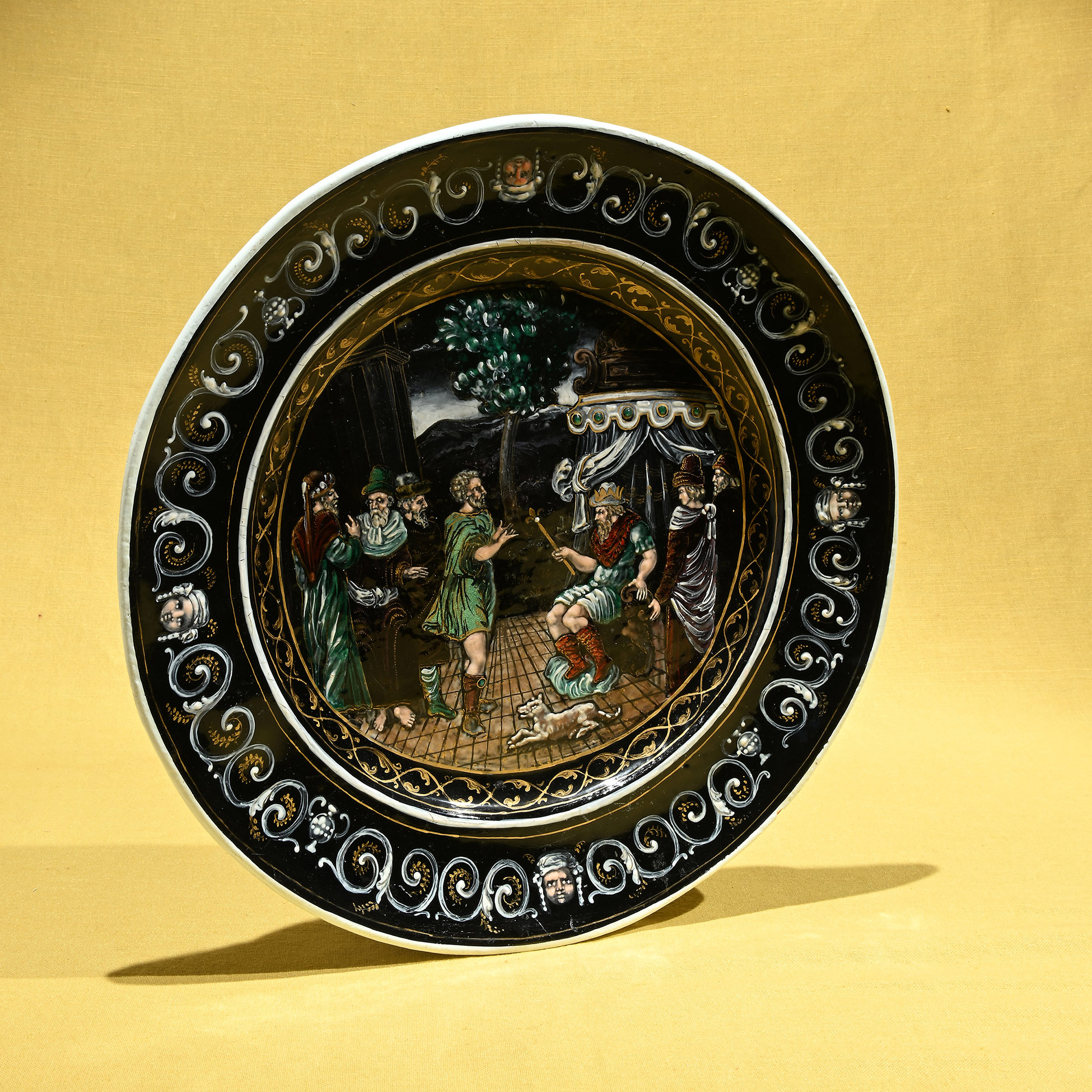 Piatto in smalto, Limoges XVIII secolo La scena centrale raffigura una scena di corte. Dimensioni complessive 32x32x2 cm.