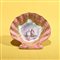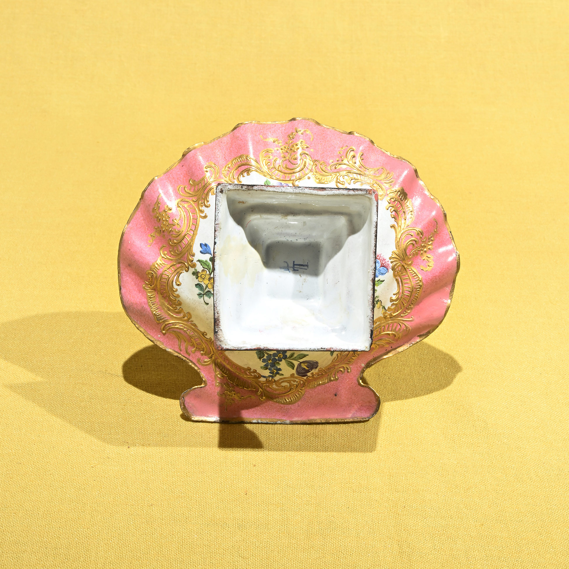 Alzatina in smalto in forma di conchiglia, Francia XIX secolo Decorato a motivi floreali su fondo bianco, motivi astratti in oro su fondo rosa e con una scena galante al centro della valva. Dimensioni complessive 4,5x13,5x12 cm.