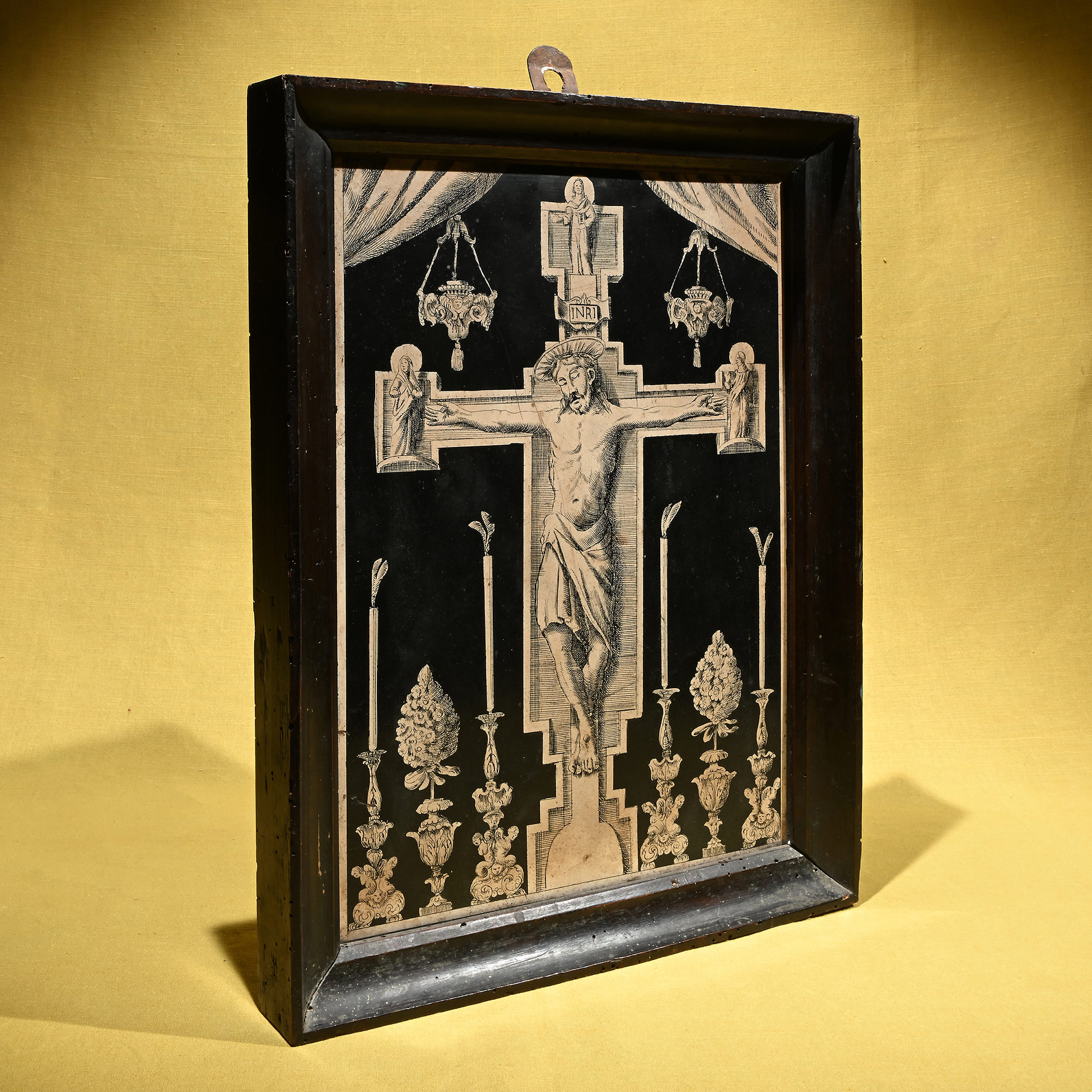 Importante placca in scagliola, manifattura toscana della fine del XVI secolo La scena centrale raffigura la Crocifissione di Cristo. Dimensioni complessive 45,5x35,5x5 cm.