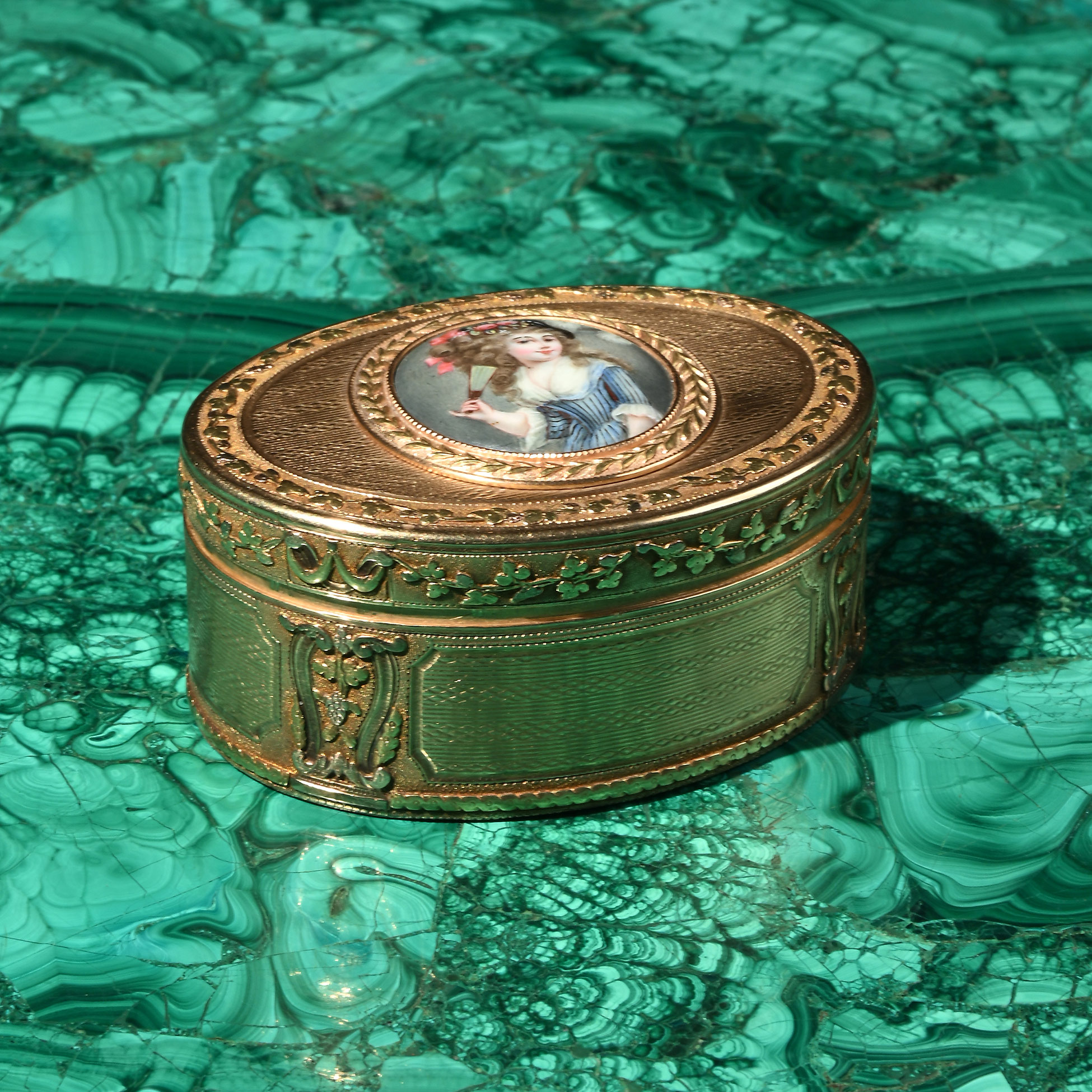 Scatola in oro e smalti, Francia fine del XVIII secolo Miniatura raffigurante gentildonna. Dimensioni 6,5x5x3,5 cm., peso complessivo gr. 91