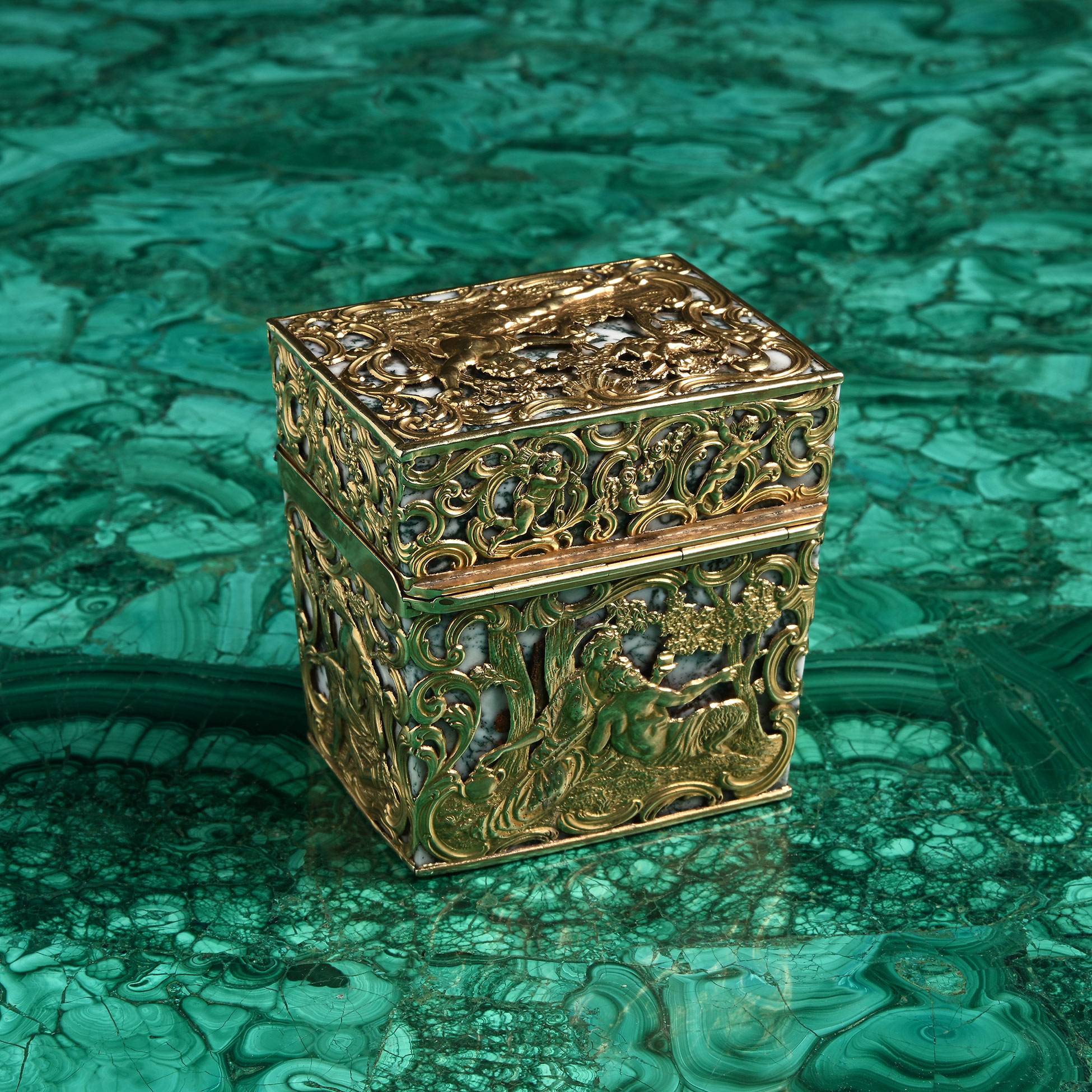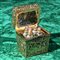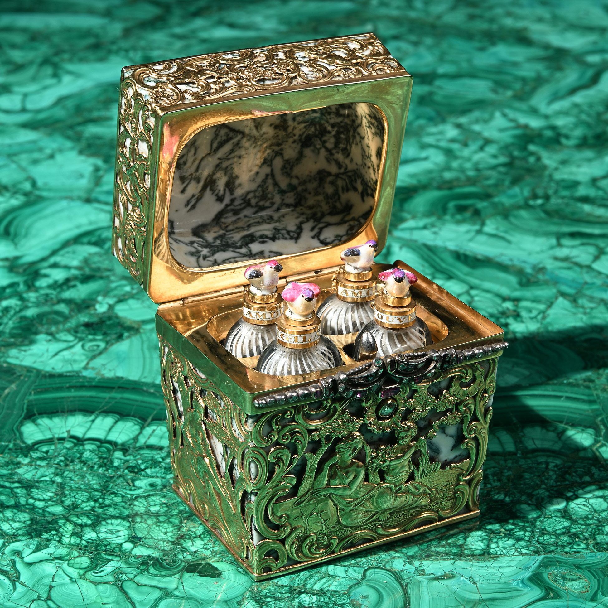 Scatola porta essenze, Francia fine del XVIII secolo In pietra dura, oro, smalti vetro e pietre preziose. All'interno quattro boccettine con tappo in forma di uccellino. Dimensioni 7x6,5x5 cm.
