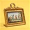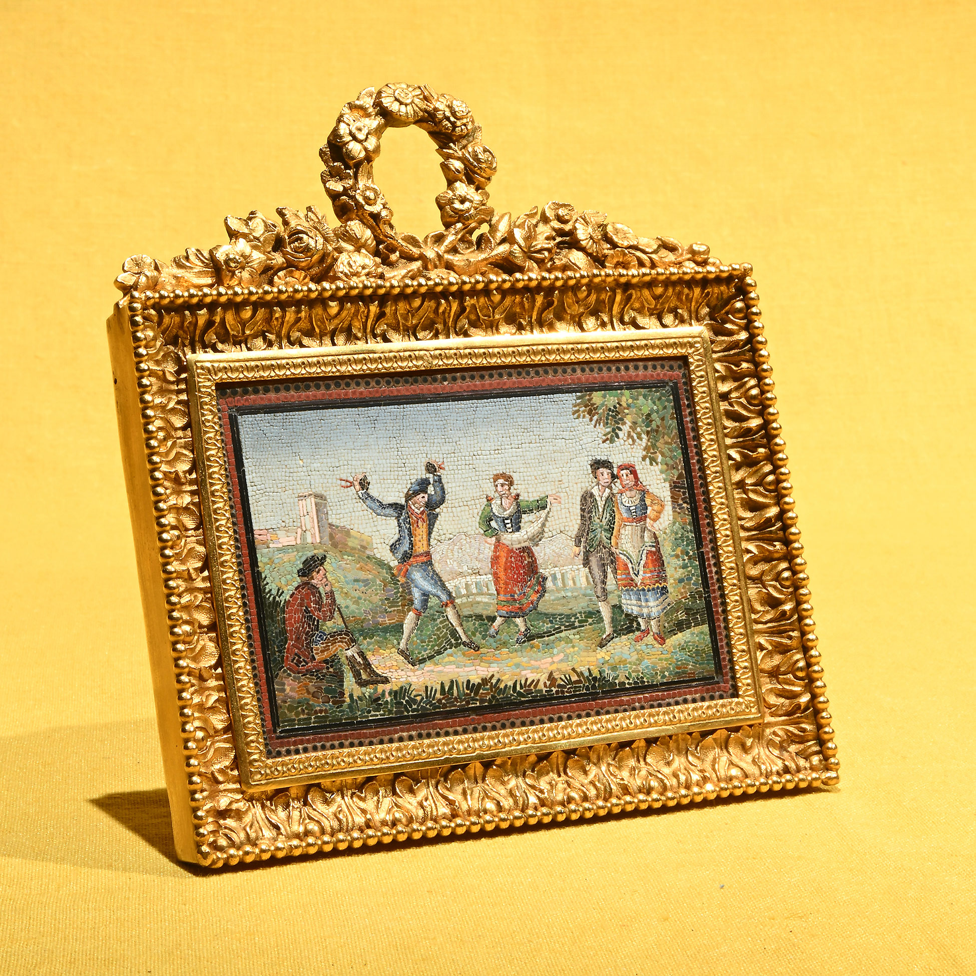 Placca in micromosaico, Roma 1830 Dotata di cornice in bronzo dorato, la scena raffigura una danza di contadini. Dimensioni complessive 14,5x14x7 cm.