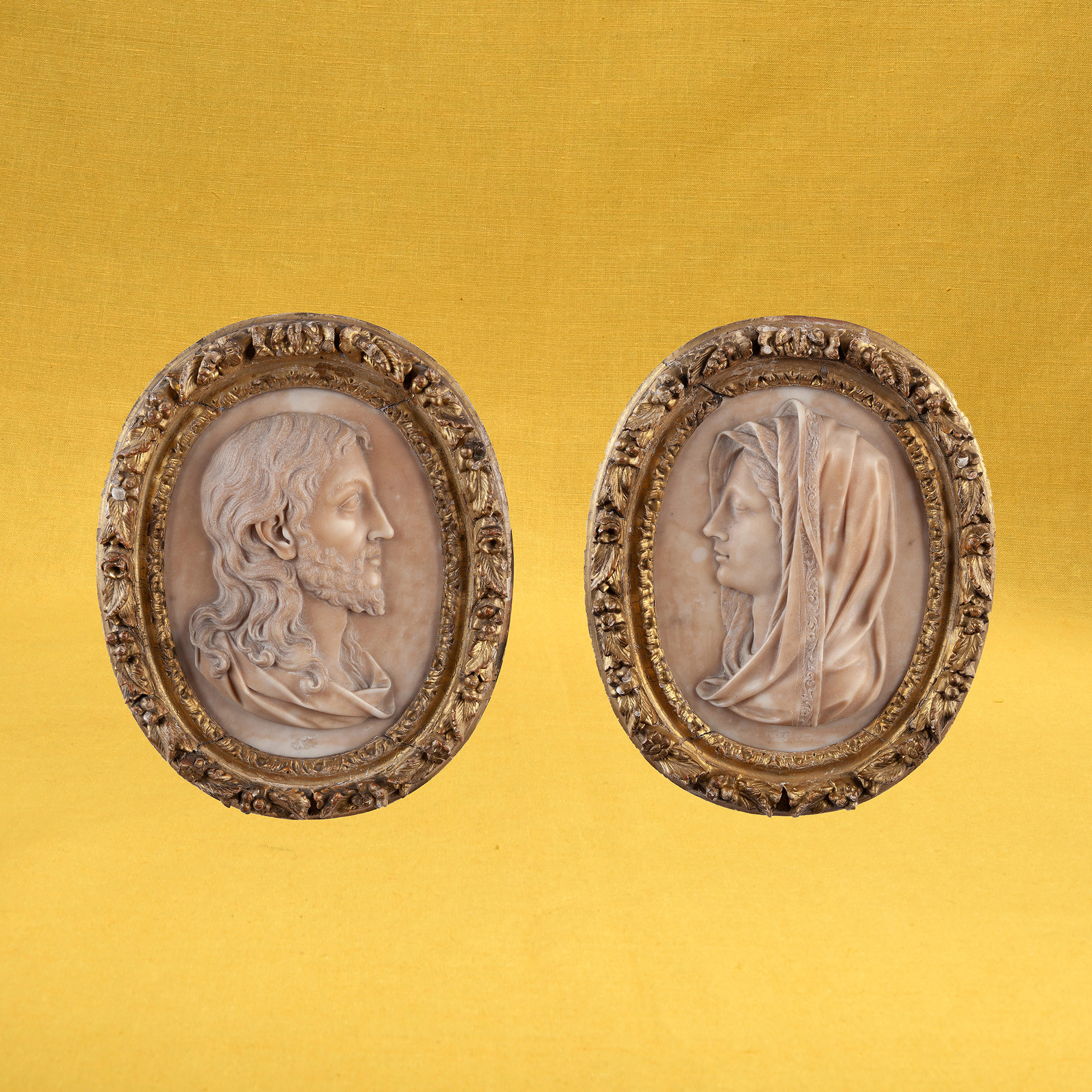 Coppia di bassorilievi in pietra dura con cornice in legno dorato, Roma fine XVII secolo I due volti di profilo raffigurano Gesù e la Vergine Maria. Dimensioni complessive 46x37x5 cm.